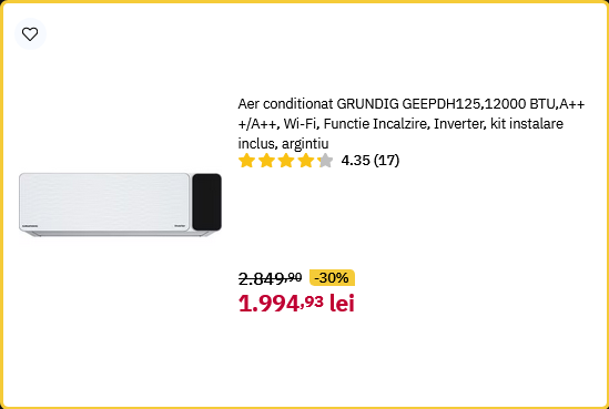 - aer condiţionat Grundig GEEPDH125 cu 12.000 BTU – 1994.93 lei;