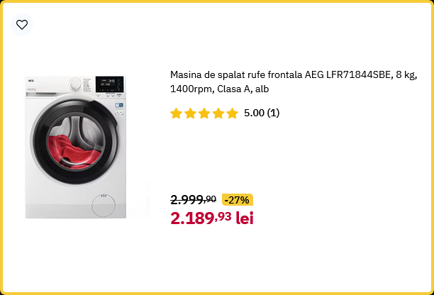 - maşină de spălat rufe frontală AEG LFR71844SBE de 8 kilograme – 2189.93 lei;