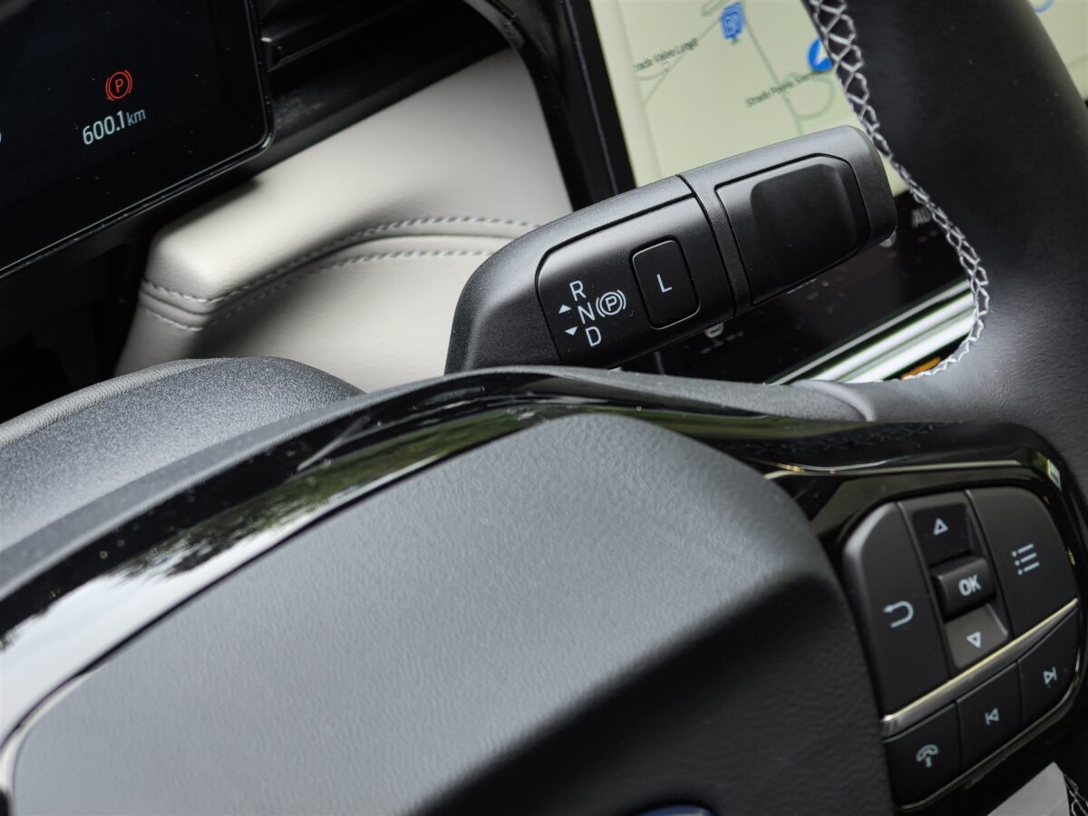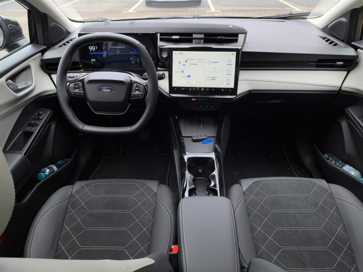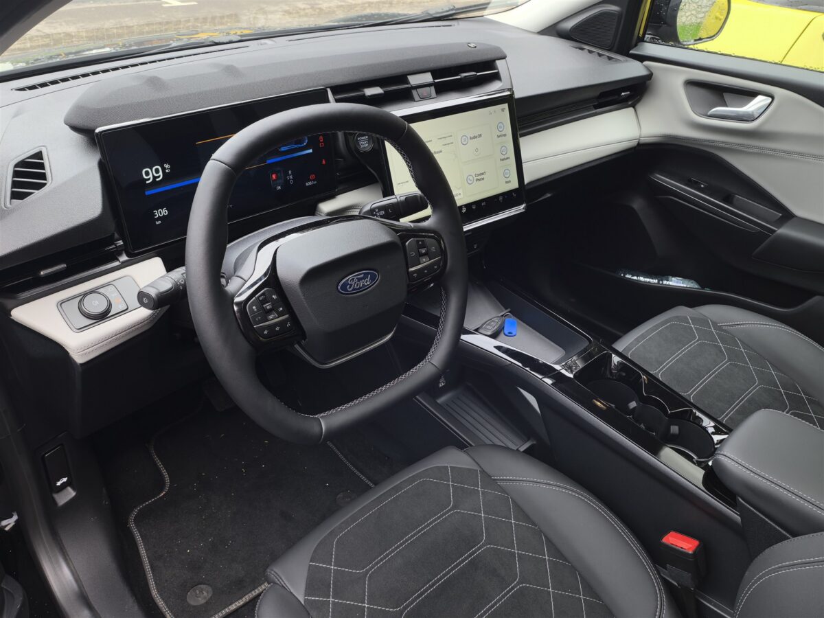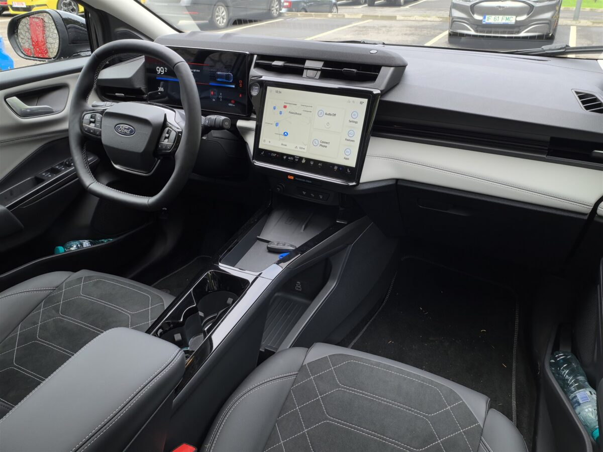 Ce mai atrage atenția în interior, este soundbar-ul de pe bord, care se întinde pe deasupra panoului de instrumente, reprezentat de un ecran de 12.8 inch. În cazul versiunii Premium, sistemul de sunet este de la B&O și are în total 10 difuzoare. Ecranul sistemului multimedia este de 12 inch, iar în spatele lui operează SYNC 4, care suportă conexiune Apple CarPlay și Android Auto wireless.