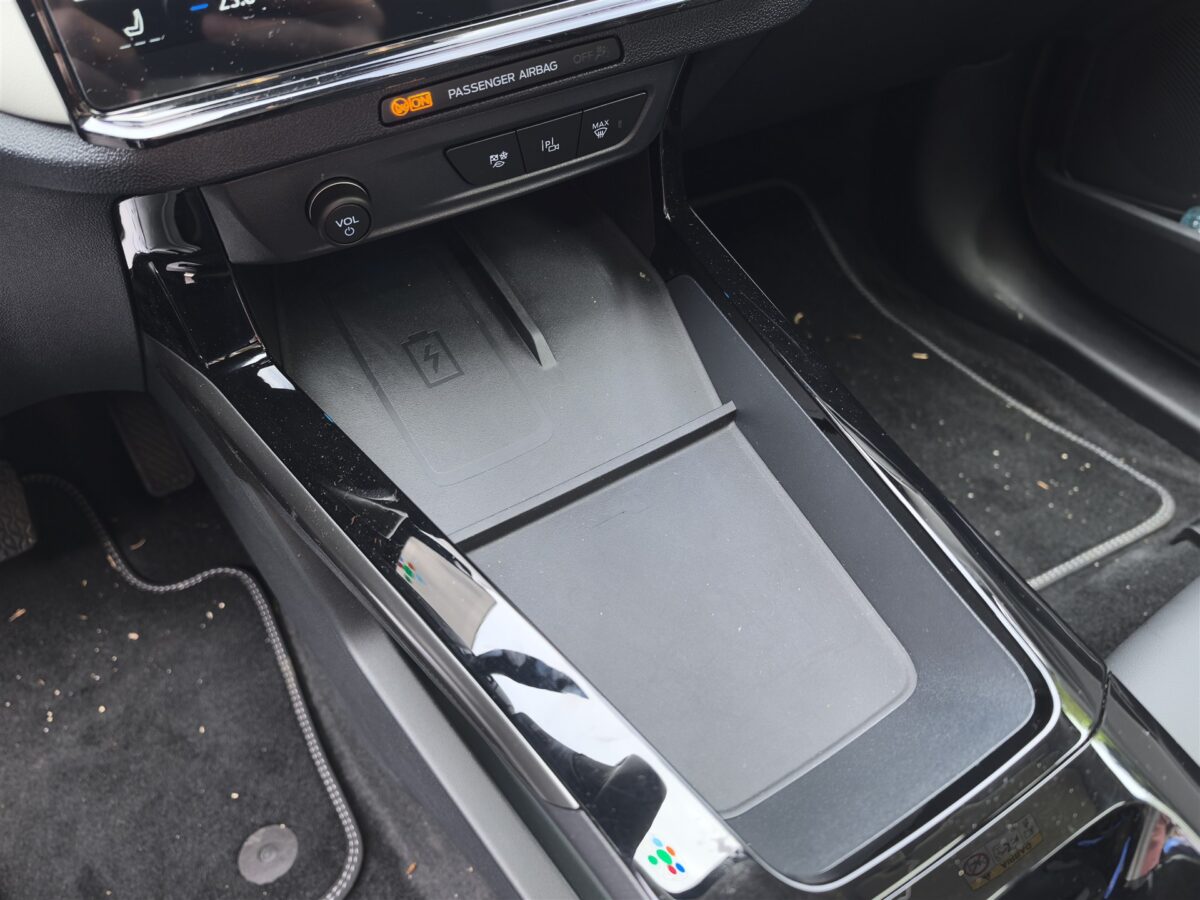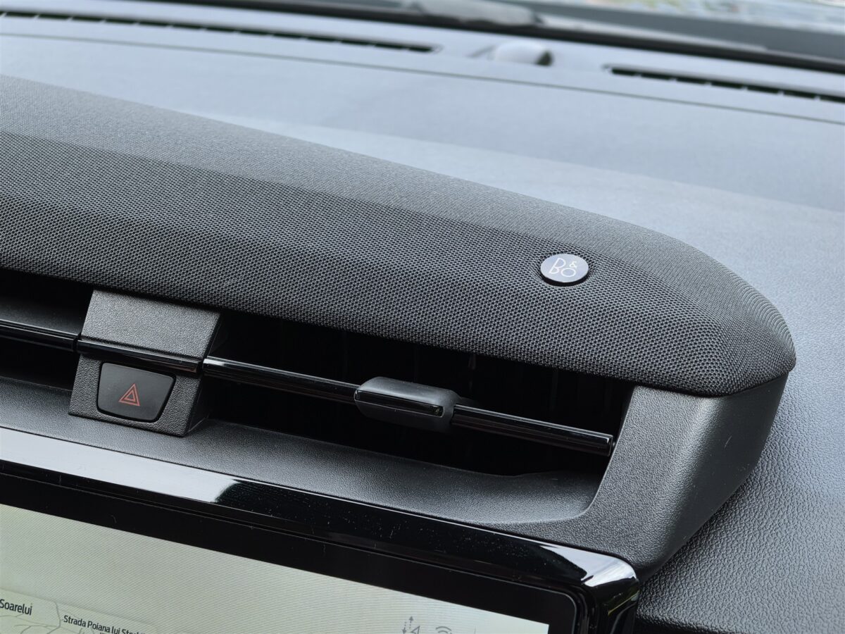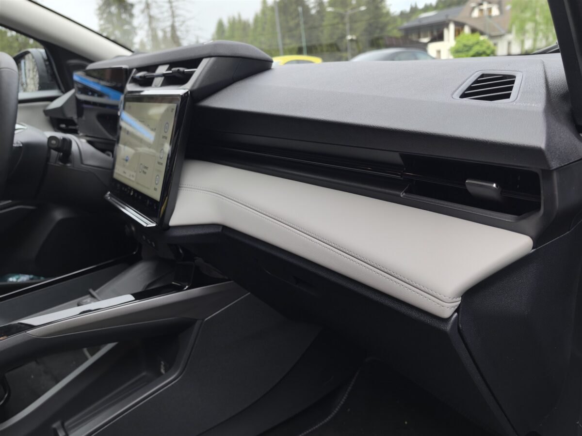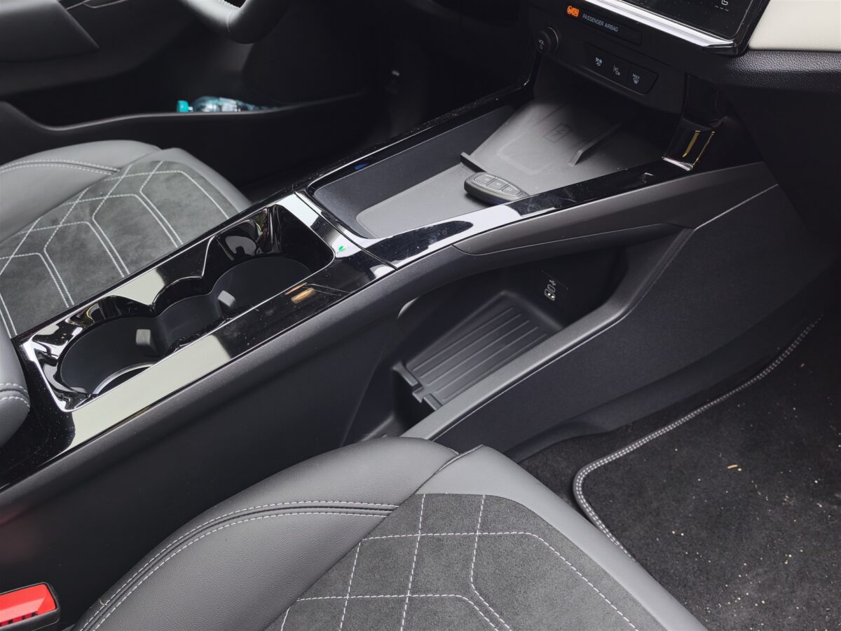 Levierul cutiei a fost mutat pe coloana de direcție, în locul a ceea ce este în mod tradițional maneta pentru ștergătoarele de parbriz (controalele acesteia sunt acum și ele pe maneta de semnalizare, unde sunt și comenzile pentru lumini – da, aglomerație mare!). Astfel, pe consola centrală este un loc pentru smartphone cu pad de încărcare wireless (standard, încă din echiparea de bază), precum și o altă zonă plană, cu cauciuc, unde mai poți pune alte obiecte, precum și două (chiar trei) suporturi pentru pahare / sticle de până la 1 litru, aș aprecial. Sub această zonă este un alt spațiu de depozitare, destul de voluminos, unde sunt și două porturi USB – unul de tip A, celălalt de tip C.