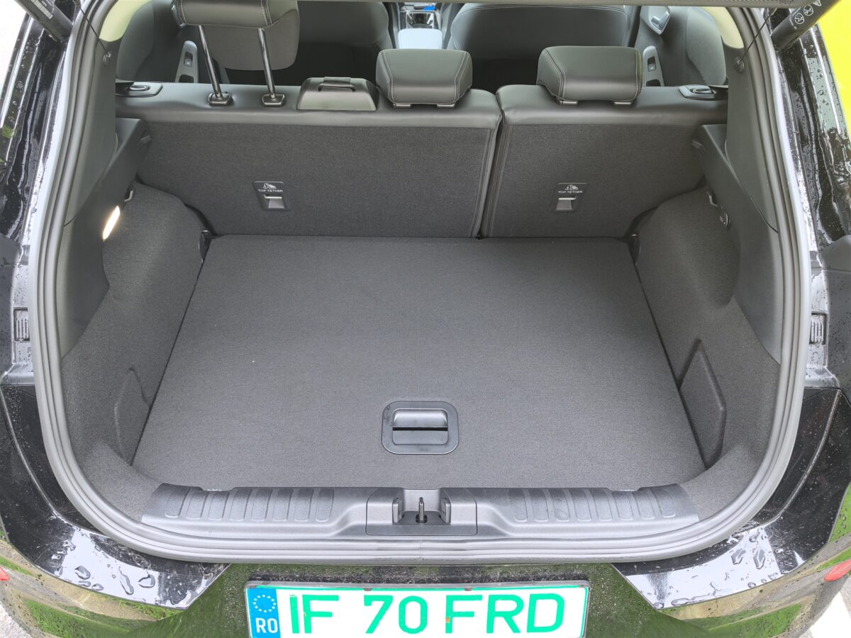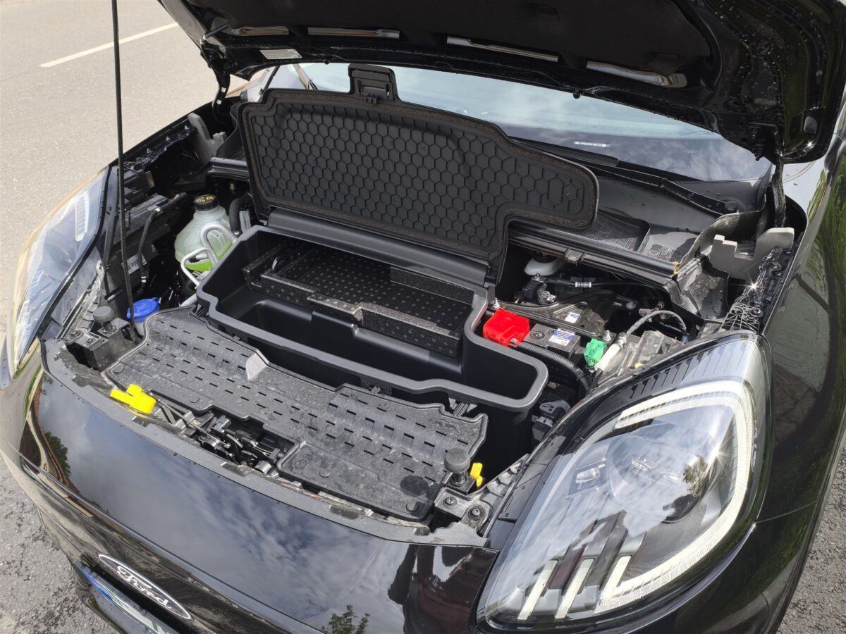 Dar volumul de încărcare nu se oprește la portbagajul spate, fiindcă Ford Puma Gen-E adaugă și un frunk (front trunk – portbagaj frontal, sub capota față) de 43 de litri. Acest spațiu este acoperit de un capac suplimentar din plastic, iar sub acesta poți depozita cablurile de încărcare, de exemplu, precum și alte nimicuri.
