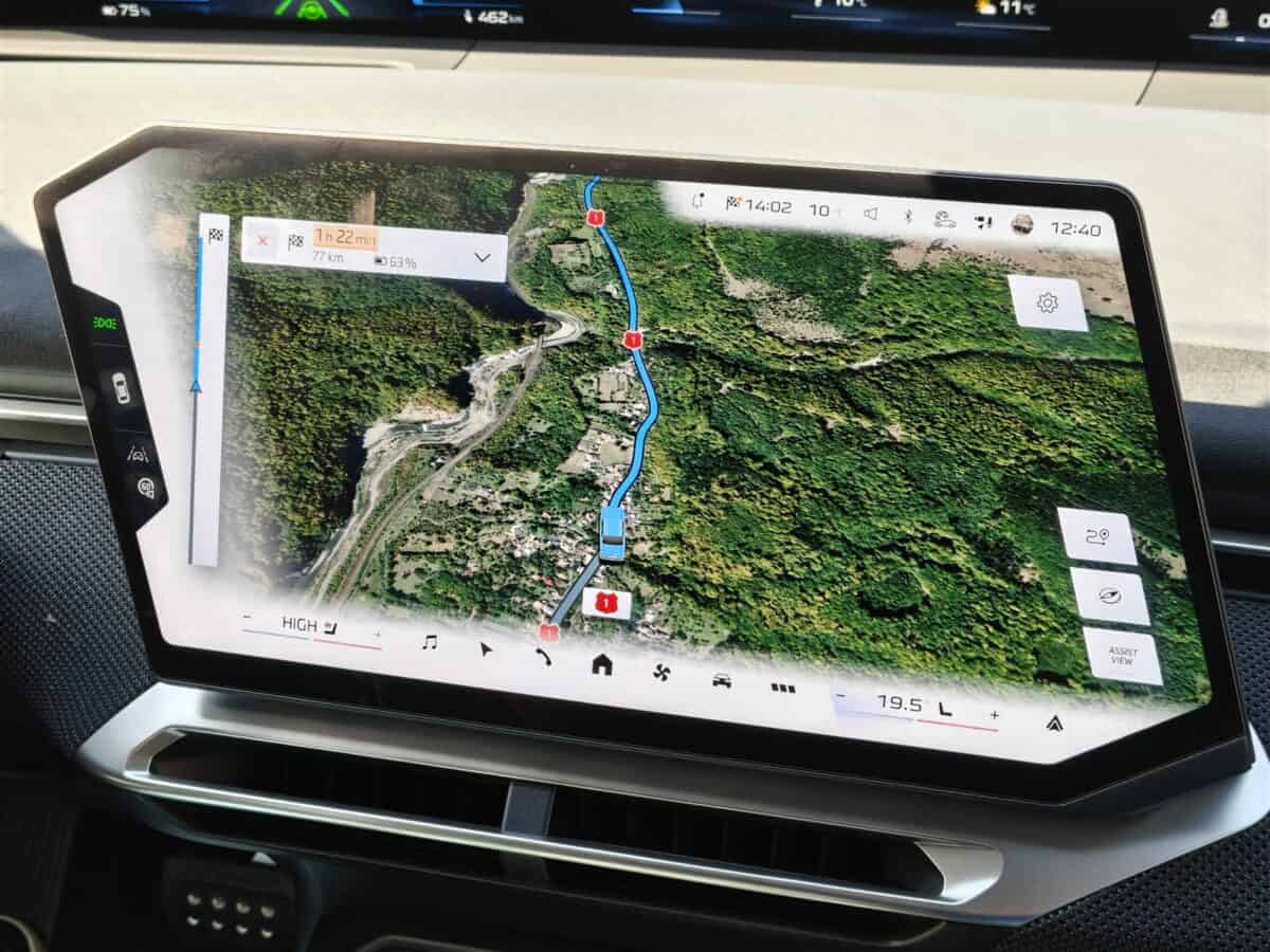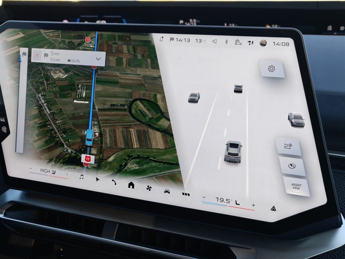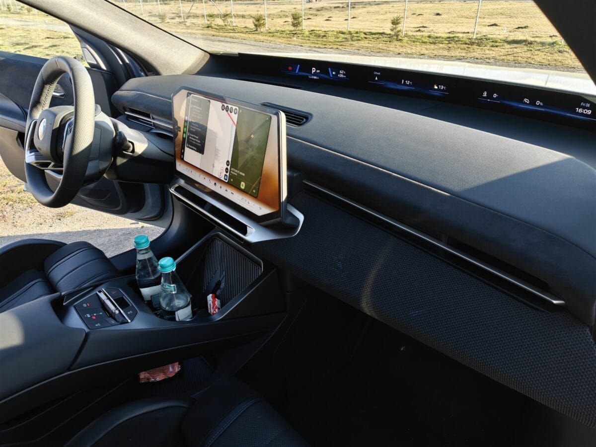 Imediat iese în evidență ecranul central masiv, cu „diagonală” de nu mai puțin de 17.9 inch. Am pus între ghilimele termenul diagonală fiindcă acest touchscreen nu are o formă clasică de dreptunghi, ci este un hexagon neregulat. Ideea a fost de a aduce câteva comenzi rapide cât mai aproape de mâna dreaptă a șoferului, pe o linie cumva paralelă cu forma volanului din acea zonă. Din partea mea, nu numai că arată bine acest ecran, dar tot ce înseamnă interfață și calitate a display-ului este la un nou nivel. Nu totul este perfect, unele setări sunt mai ascunse decât mi-aș fi dorit, dar după câteva ore de interacțiune totul devine din ce în ce mai lesne de înțeles, găsești rapid mai tot ce ai nevoie să accesezi.