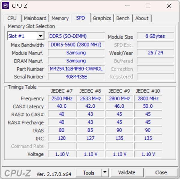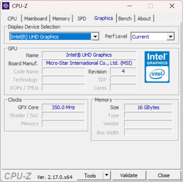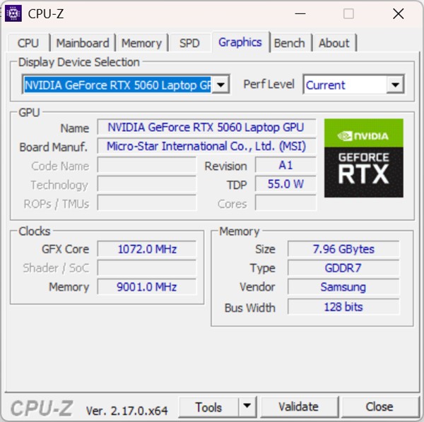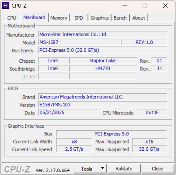 Capturi de ecran din CPU-Z cu informații despre ansamblul hardware al laptopului MSI Katana 15 HX B14W: