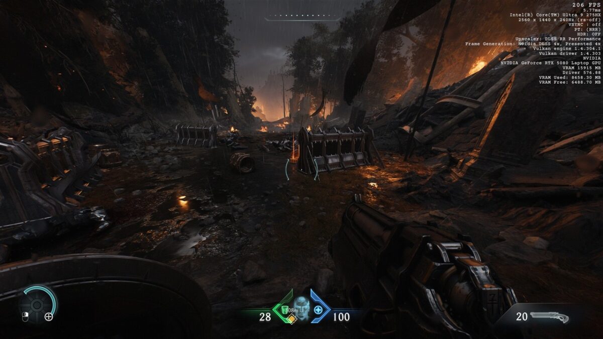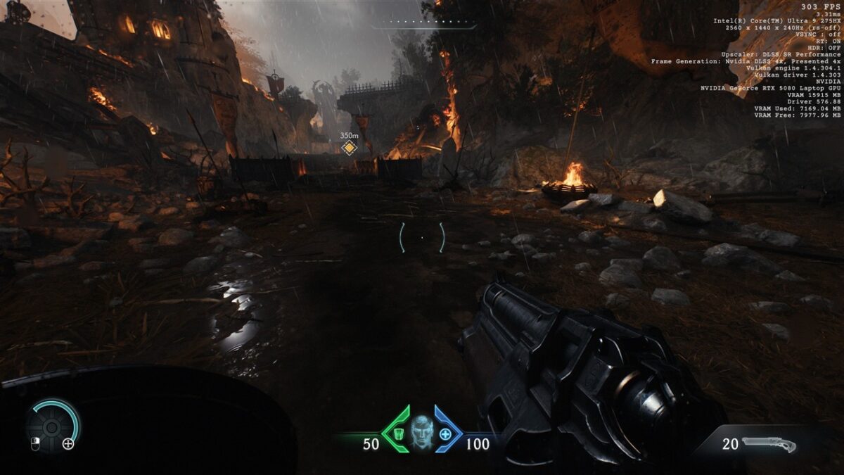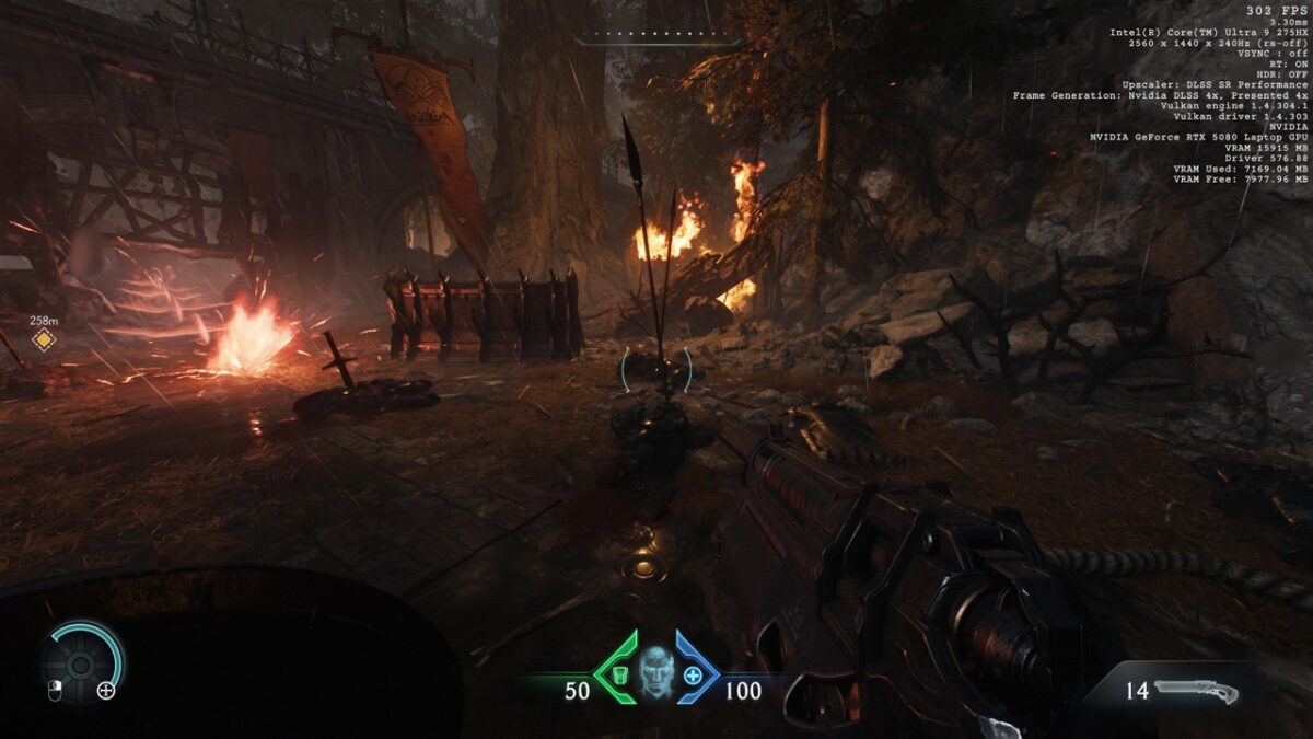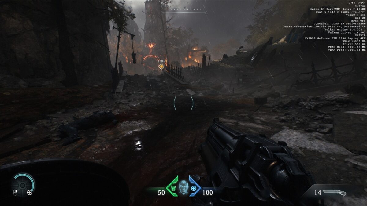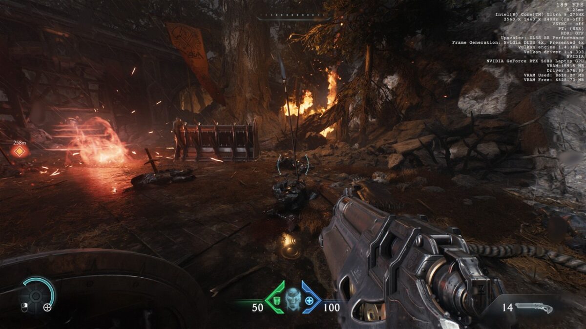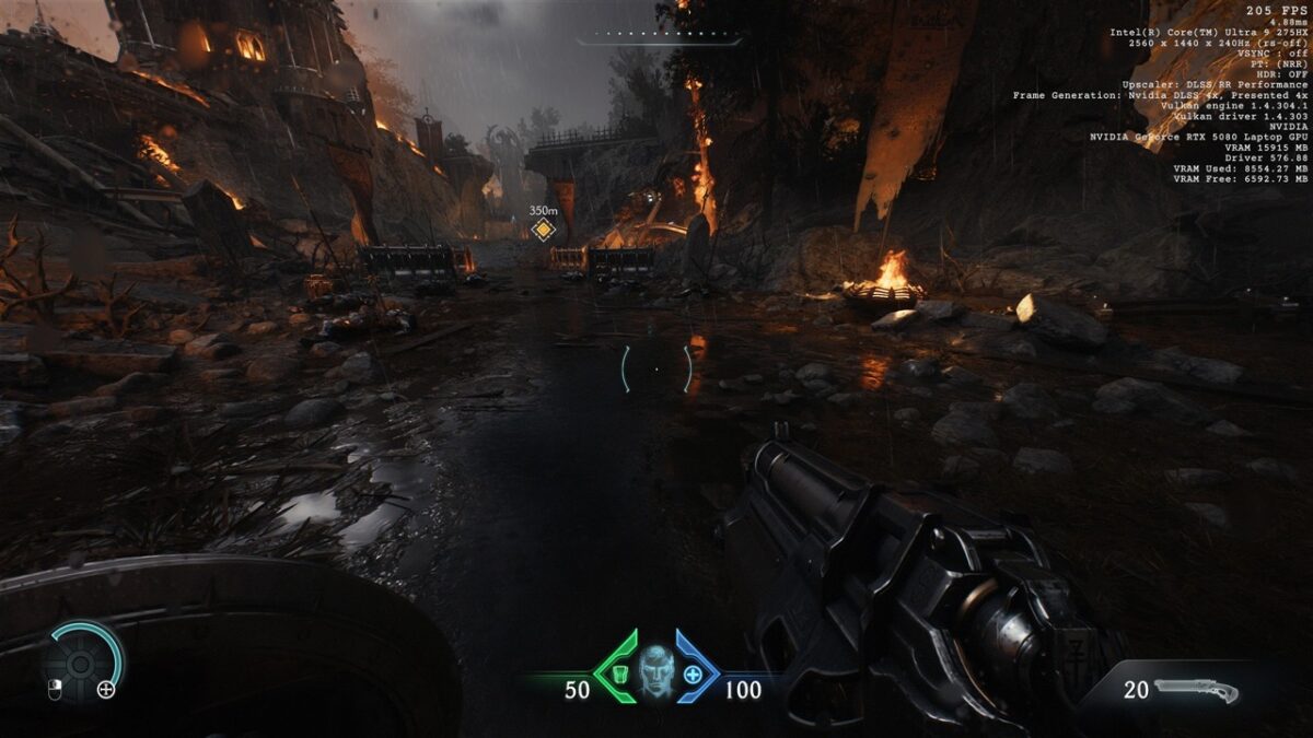 Totodată, în toate seturile cu imagini de mai sus din DOOM: The Dark Ages, observăm cum se prezintă și fps-ul în acest joc, atunci când folosim DLSS 4, precum și când această tehnologie nu este activată. Vedem că de la un fps de peste 200 cu DLSS 4 cu Multi-Frame Generation 4X activ se ajunge la doar circa 50 fps fără DLSS, ceea ce reprezintă o diferență uriașă, de preferat pentru un gameplay cursiv.