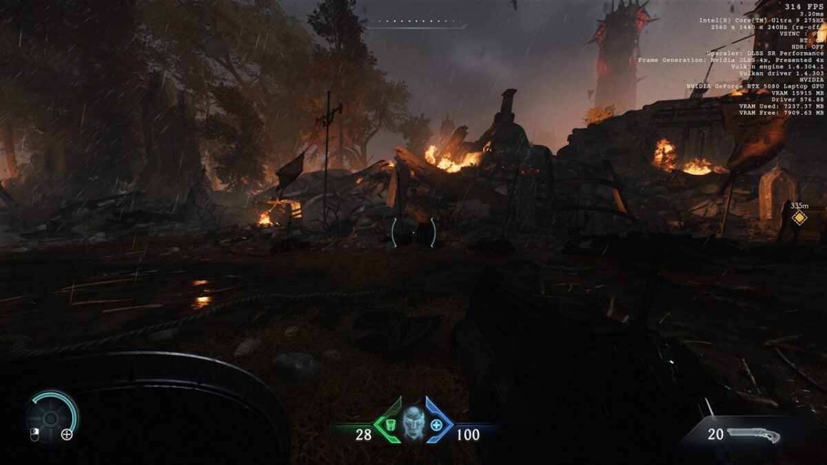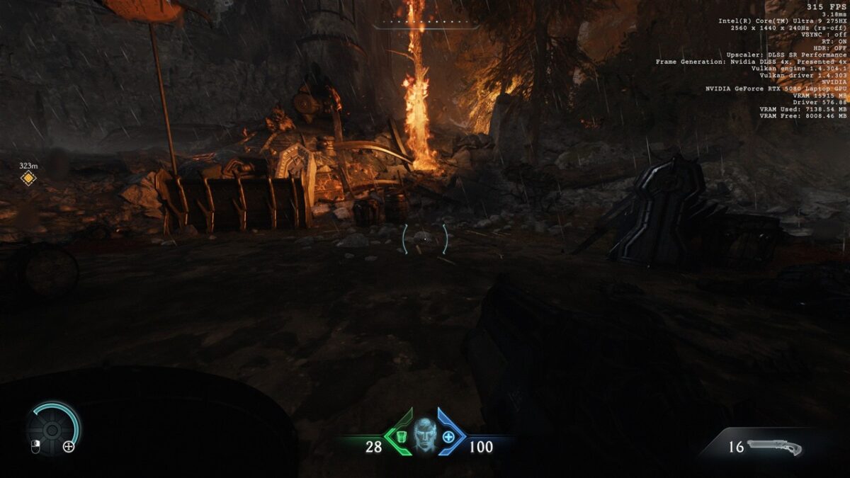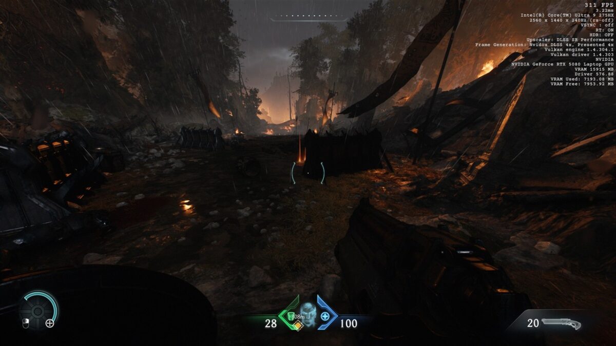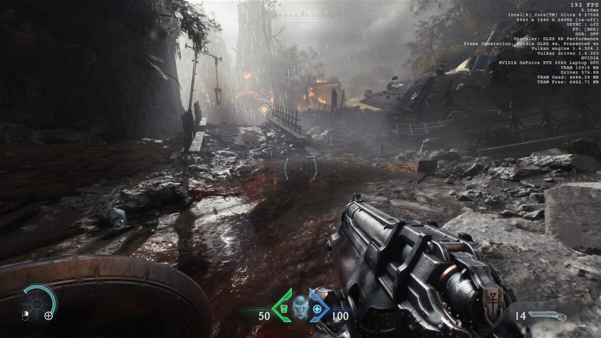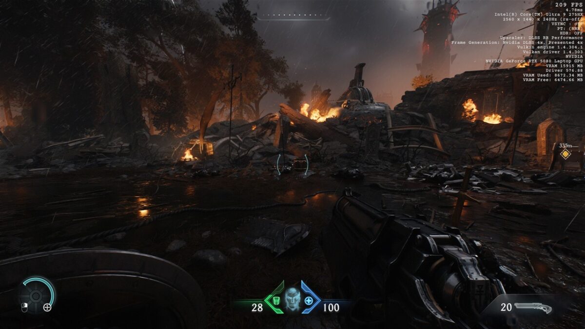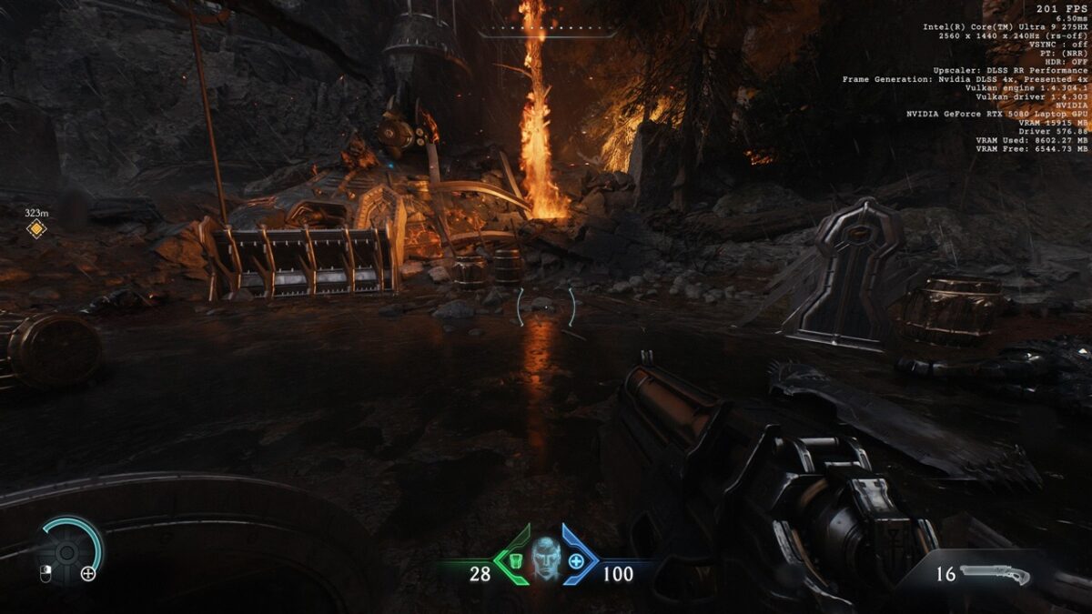 Totodată, în toate seturile cu imagini de mai sus din DOOM: The Dark Ages, observăm cum se prezintă și fps-ul în acest joc, atunci când folosim DLSS 4, precum și când această tehnologie nu este activată. Vedem că de la un fps de peste 200 cu DLSS 4 cu Multi-Frame Generation 4X activ se ajunge la doar circa 50 fps fără DLSS, ceea ce reprezintă o diferență uriașă, de preferat pentru un gameplay cursiv.