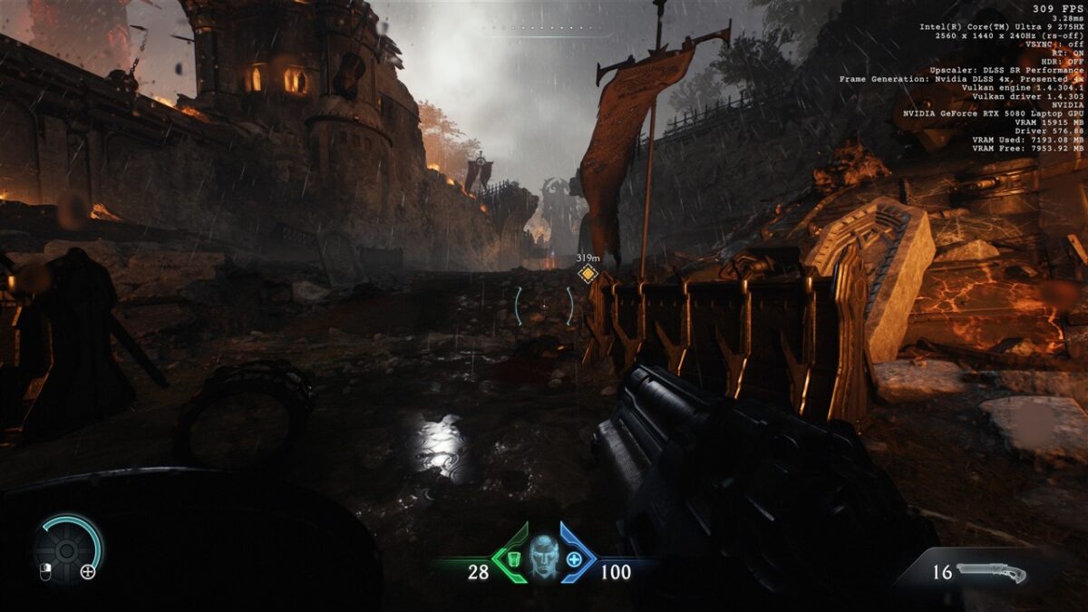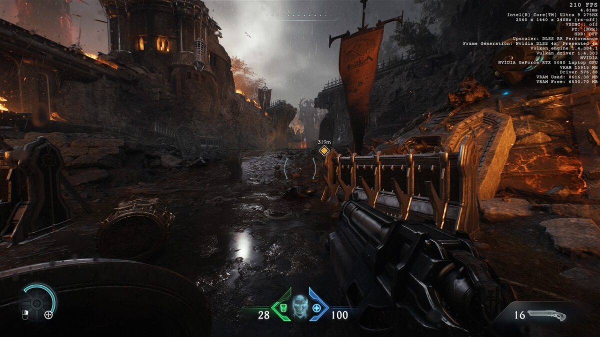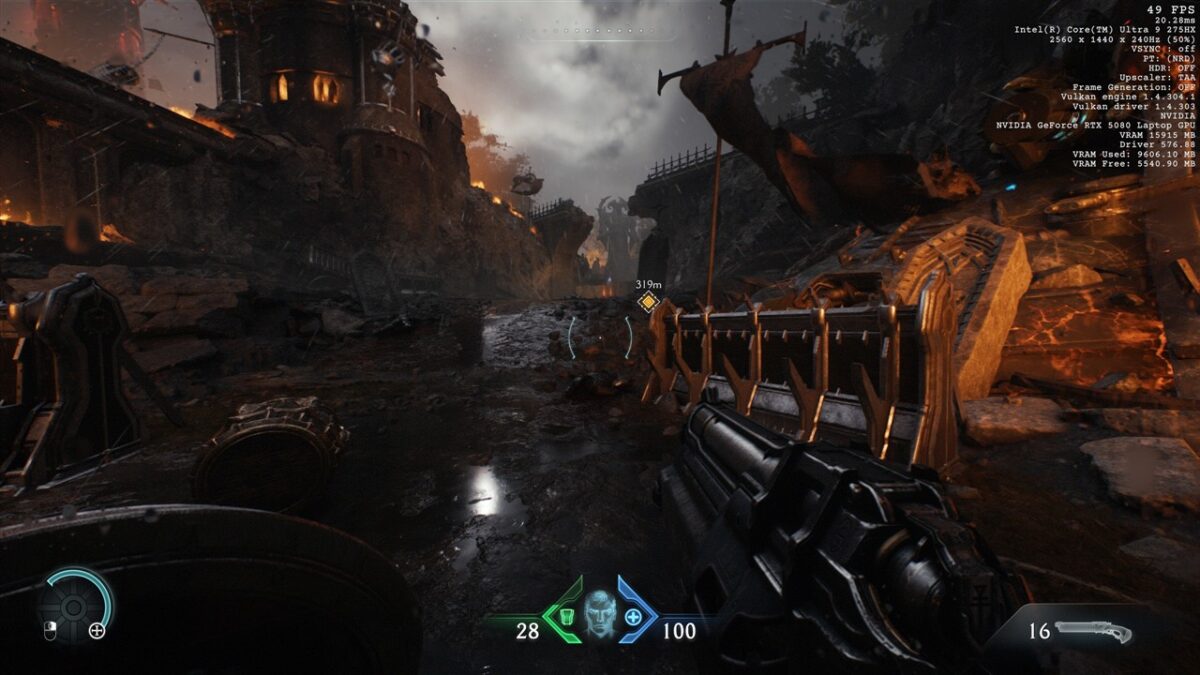 Eu am rulat DOOM: The Dark Ages la o rezoluție 2K (2560 x 1440 pixeli) și cu detaliile grafice pe High, așa cum se poate observa din imaginile de mai jos: