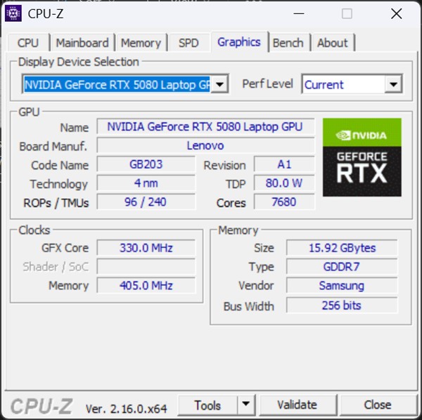 Înainte de a vedea câteva cadre din timpul unui scurt gameplay din acest joc, haideți să parcurgem rapid, prin intermediul unor capturi de ecran din CPU-Z, ansamblul hardware al laptopului pe care am făcut testul, care are în centru o placă grafică dedicată NVIDIA GeForce RTX 5080: