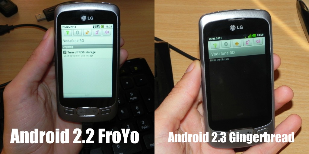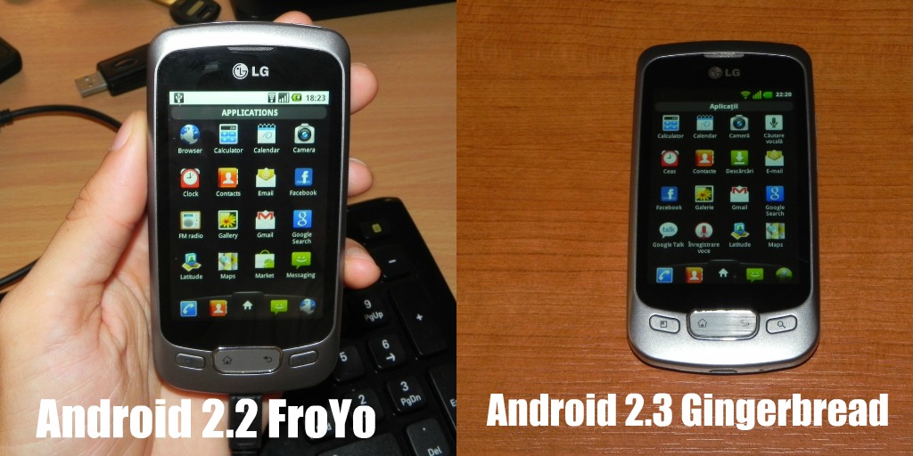 Dezamăgirea constă că vizual nu au fost schimbate decât câteva icoane. Toate aplicaţiile instalate sunt la locul lor. Tastatura touchscreen qwerty nu suferă nicio schimbare. În partea superioară veţi observa că fundalul adoptat este pe negru faţă de alb la 2.2 FroYo. Aparent se mişcă mai bine în browsing şi pare mai stabil. Am vrut să pun şi video, dar schimbările sunt aproape inexistente şi nu am ce să scot în evidenţă. Bănuiesc că nici hardware-ul nu este prea ofertant, dar apreciez că LG a adus Gingerbread pe LG Optimus One pe când HTC pe Desire încă nu a făcut trecerea şi la un moment dat se vorbea că vor lăsa Desire cu 2.2 FroYo.
