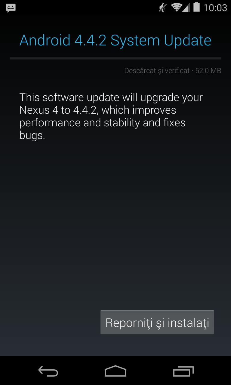 Mai zilele trecute discutam de Android 4.4.1 și Google deja a pornit Android 4.4.2 KitKat pentru LG Nexus 5, LG Nexus 5, Google Nexus 7 în ediția pe 2013 și Google Nexus 10. Folosesc Nexus 4 și nu primisem Android 4.4.1, dar de dimineață mă aștepta o notificare cum că Android 4.4.2 este disponibil și așteaptă să-mi restartez smartphone-ul ca să-și facă instalarea.