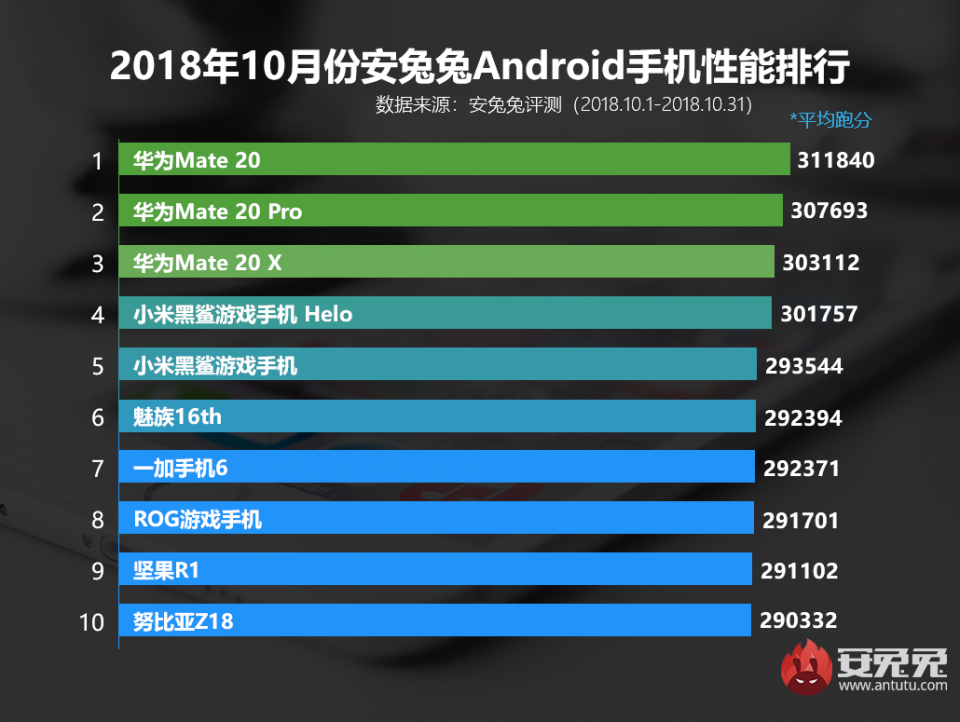 Topul pe octombrie este primul care include smartphone-uri ce depăşesc 300.000 de puncte şi după cum era de aşteptat Huawei a acaparat fără emoţie primele 3 locuri. Procesorul Huawei HiSilicon Kirin 980 construit pe o tehnologie de 7 nm îşi face simţită prezenţa şi îl depăşeşte pe campionul ultimelor luni: procesorul Qualcomm Snapdragon 845.