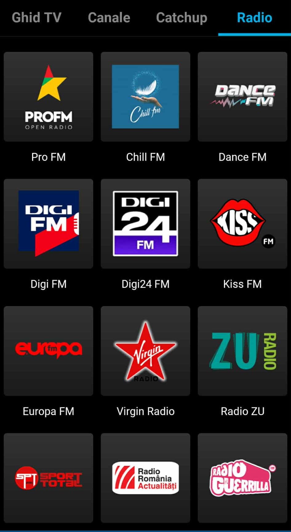 • categoria radio (utilizatorii pot descoperi acum în aplicaţie şi o categorie dedicată posturilor de radio, una formată din 17 staţii: Dance FM, Digi FM, Digi24 FM, Chill FM, Pro FM, Kiss FM, Europa FM, Virgin Radio, Radio ZU, Radio România Actualităţi, Radio Guerilla, Radio Sport Total, Radio Impuls, Radio Maria, Radio Ercis, Radio Vocea Speranţei şi Realitatea FM).