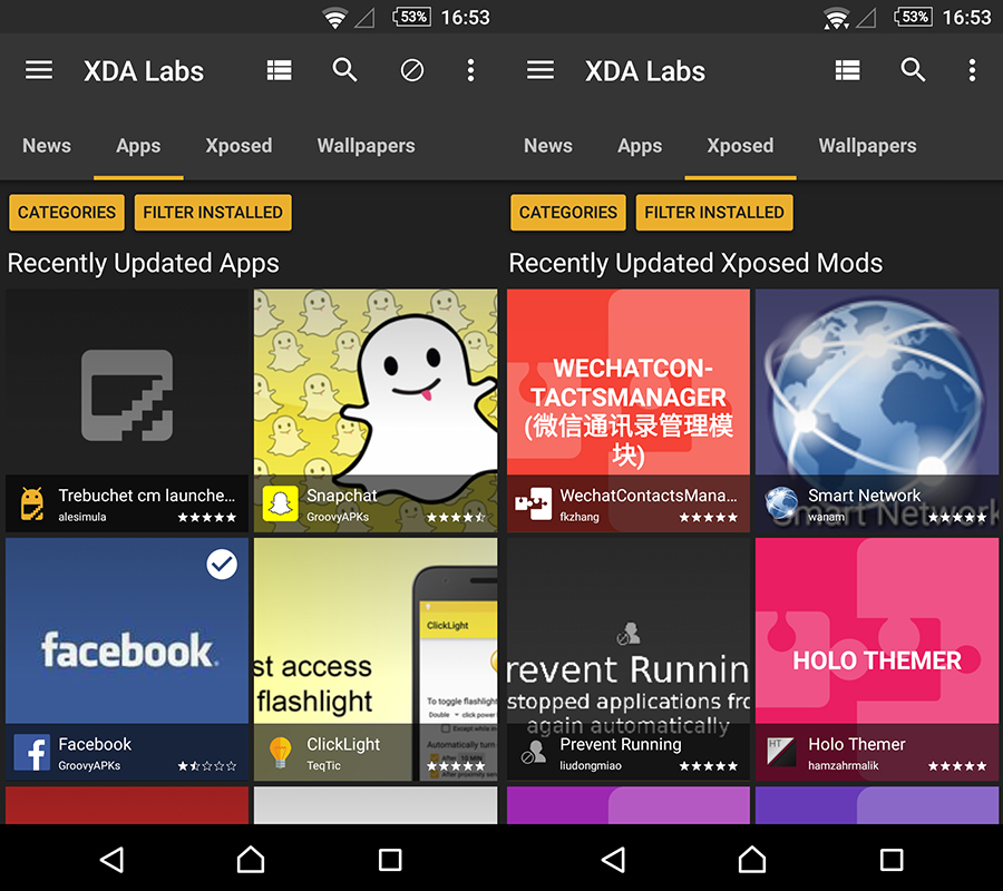 Două din funcțiile acestei aplicații ce mi s-au părut foarte interesante sunt categoria de aplicații și cea de module Xposed. Aici vei putea găsi listate cele mai noi aplicații și module Xposed dezvoltate de mebrii comunității, multe din acestea nefiind disponibile în Google App Store sau în repo-ul oficial Xposed. Mai mult, aceste rubrici permit actualizarea aplicațiilor și a modulelor Xposed deja instalate pe terminalele noastre.