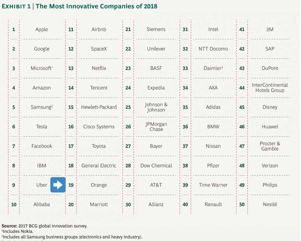 În fiecare an, The Boston Consulting Group, una dintre cele mai cunoscute firme de consultanță în management la nivel global, identifică cele mai inovatoare 50 de companii din întreaga lume. Clasamentul este întocmit la nivel mondial în baza unui sondaj de opinie la care participă 1500 de directori de inovare din industrii diferite.
