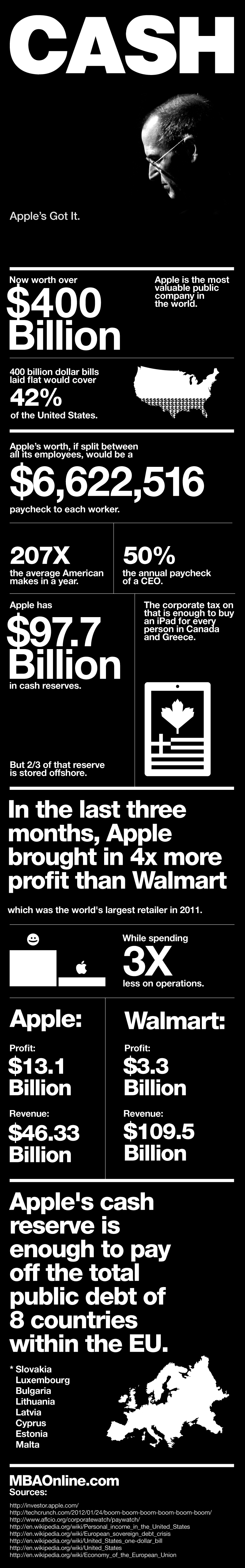 Faptul că Apple face o grămadă de bani nu mai este un secret. Va prezentăm un infografic realizat de MBA Online, prin care se arată ce mamut financiar a devenit Apple. În acest infografic veţi găsi atât informaţii financiare foarte interesante, cât şi comparaţii  pe atât de utile, pe atât de ciudate.