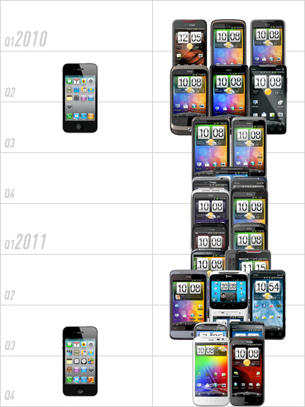 O imagine pe care descoperit-o via twitter și reprezintă realitatea de pe tech mobile în 2010 și 2011 când Apple a adus doar două modele noi: iPhone 4 și iPhone 4S, iar HTC a adus o multitudine de modele. Sunt curios cum ar arăta o astfel de imagine cu temele: Apple vs Samsung, Apple vs Motorola sau Nokia, Sony Ericsson.