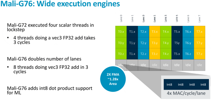 Alături de ARM Cortex-A76 au fost prezentate câteva detalii şi pentru acceleratorul grafic Mali-G76 GPU. Acesta va oferi suport pentru AI, pentru înregistrări video 8K la 30 fps şi 4K la 60 fps, va oferi între 2 şi 8 unităţi de procesare cu frecvenţă de 600 MHz (în funcţie de configuraţie) şi va utiliza un encoder H.264 cu procesare pe 10 biţi (HDR).