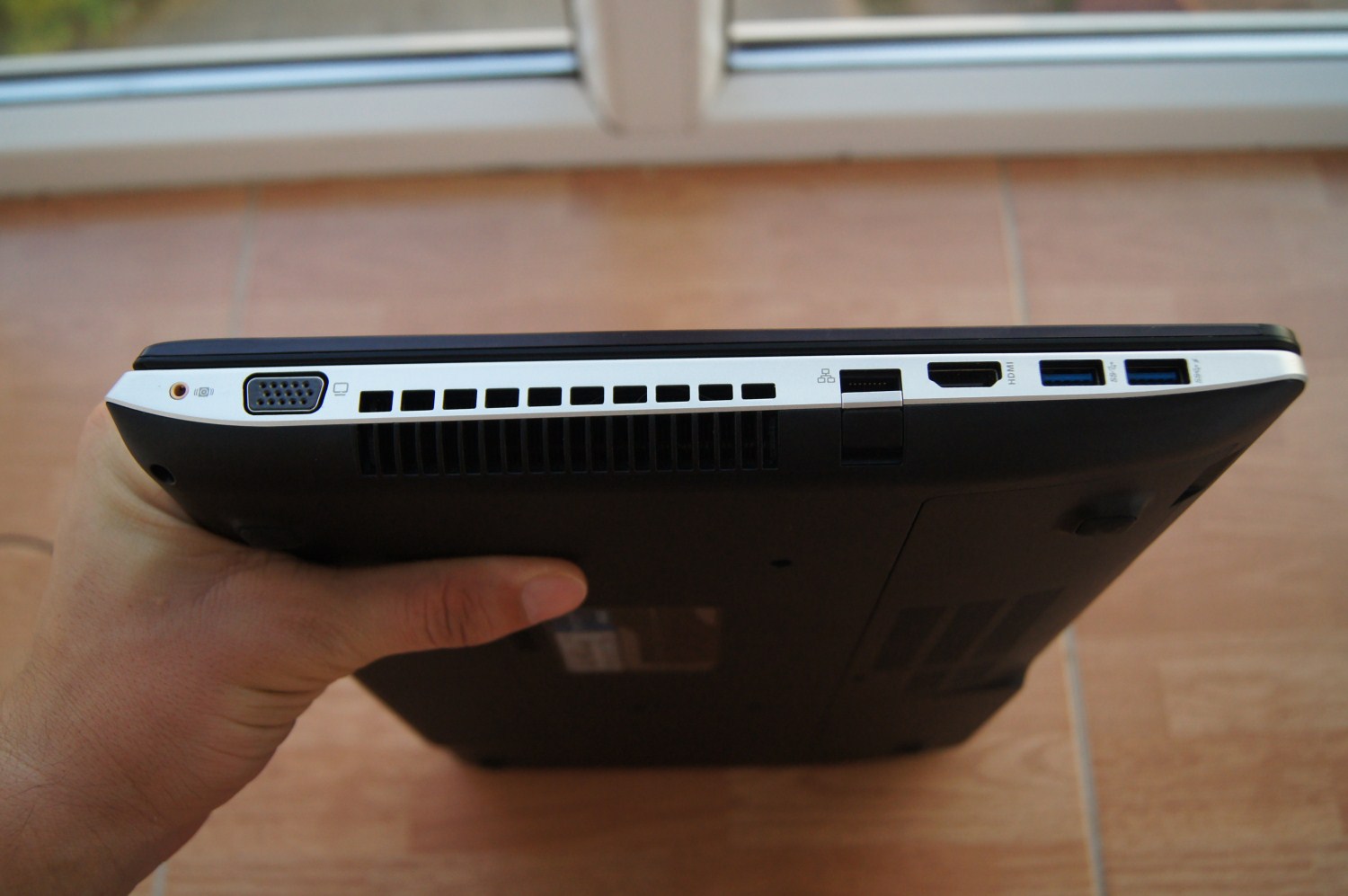 Pe lateral în partea dreapta dați de jack-ul pentru încărcător, unitatea blu-ray, 2 x USB 3.0 și jack-urile de 3.5 mm pentru căști și microfon. În partea stângă regăsiți jack-ul de 2.5 mm pentru subwoofer-ul inclus în pachet, VGA, zona prin care laptopul își face răcirea, RJ-45 protejat într-un mod interesant și util, HDMI și 2 x USB 3.0. În partea frontală a fost poziționat cititorul de carduri SD. Are de toate și nu i se poate spune că-i lipsește vreun conector. Dispune și de blu-ray player, așa că filmele cu cea mai bună grafică pot fi redate fără probleme pe N56.