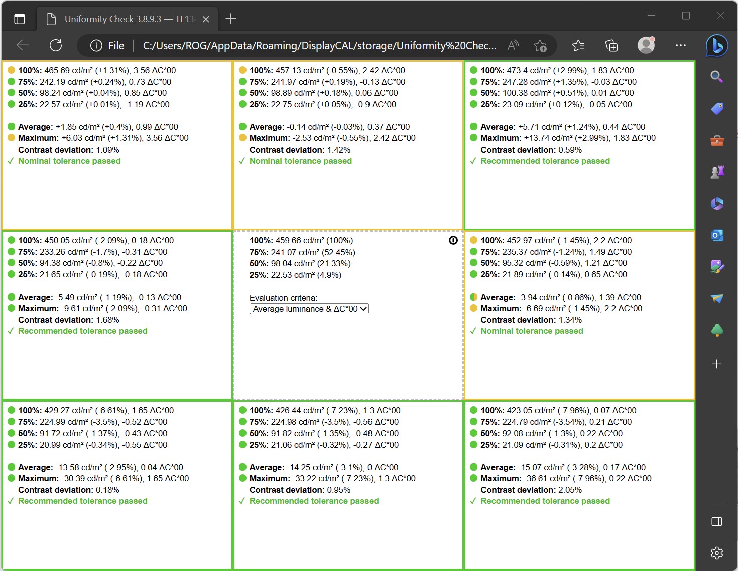 În ceea ce provește uniformitatea luminozității, putem spune că panoul este în gama bună, doar colțurile stânga jos și mijloc jos au fost cu aprox 30 cd/m2 mai puțin strălucitoare, adică avem o deviație de 6 – 7%, ceea ce este cu mult sub limitele standardului acceptat – adică un maxim de 10 – 15%. Avem un panou destul de uniform. Nu e un record ceva, dar pentru un panou necunoscut mie (ID panou: TL134ADXP01-0), se menține foarte bine.