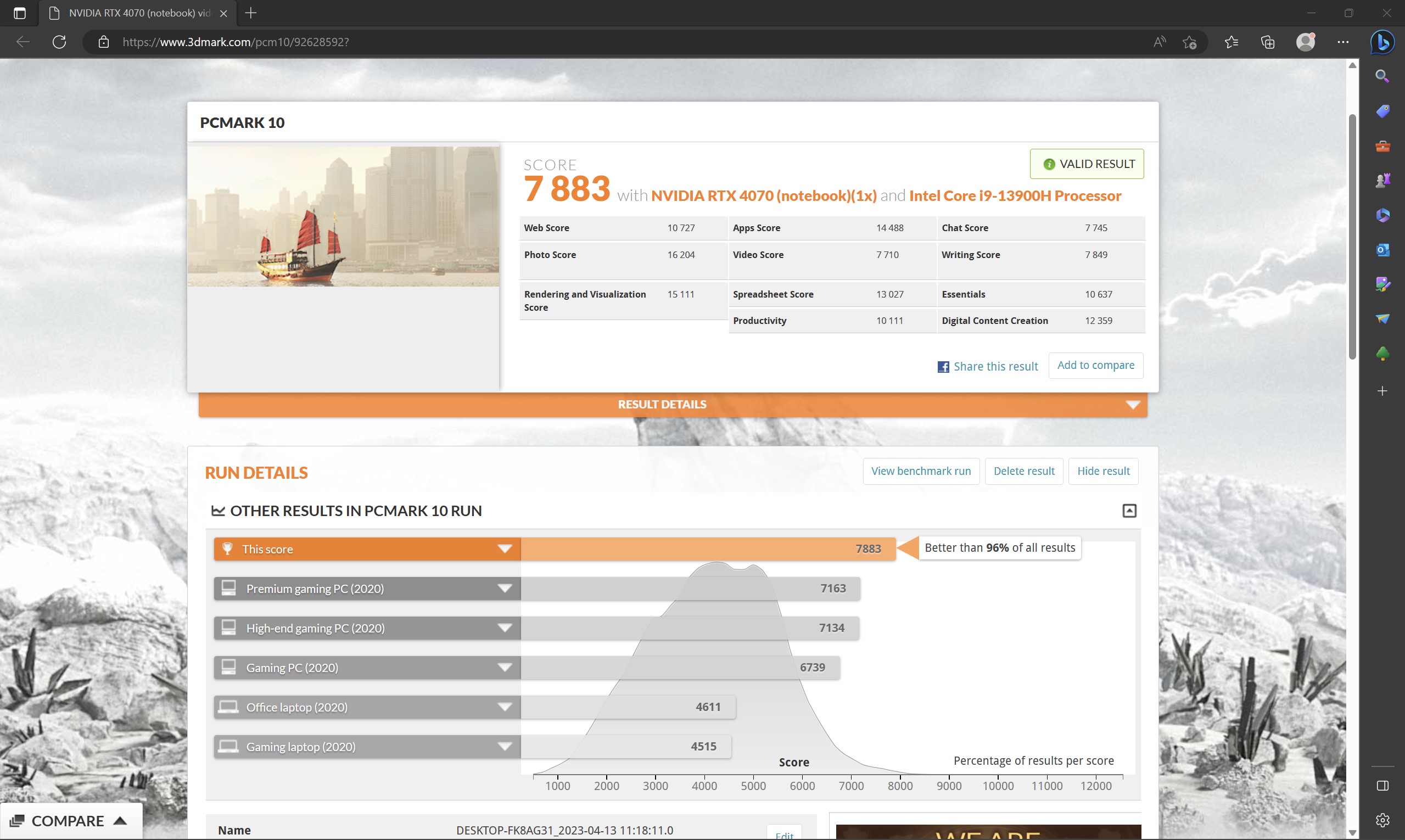 Așa cum se vede din graficul de mai jos, PCMark10 ne spune că scorul este ”mai bun decât 96% din toate rezultatele” – cele din bazele lor de date, încărcate de utilizatori, după efectuarea acestui test.