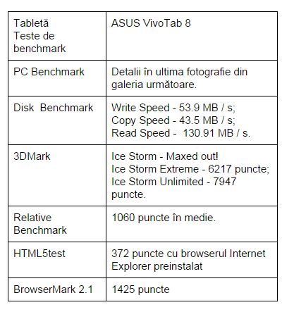 Am făcut câteva teste de benchmark și rezultatele obținute de tableta ASUS le găsiți în tabel: