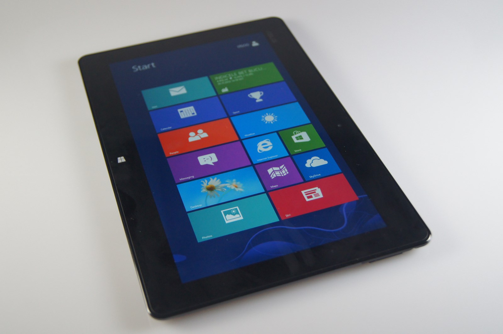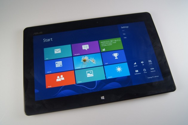 Avem celebrul ecran de start cu interfața Modern UI, era să folosesc vechiul termen de Metro care a fost abandonat pentru unul cu mai mare priză la marketing. Interfața este fluentă, place în utilizare. Printr-un gest swipe în dreapta dați de: Search, Share, Start, Devices, Settings – setările. La prima atingere pe Settings se oferă o serie de scurtături și informații vis-a-vis de rețeaua Wi-Fi la care tableta este conectată, volumul și nivelul său, luminozitatea display-ului, Notificările, Power – pentru oprirea tabletei, ce tastatură a fost presetată (are și pe cea pentru limba română inclusă).