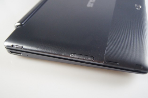 Logo-ul ASUS este abia perceptibil în partea stângă sus, butonul capacitiv cu simbolul Windows 8 a fost poziționat central, roul său este de a te duce în meniul de start din Windows RT, la fel ca și simbolul similar de pe tastatura dock când aceasta este cuplată.