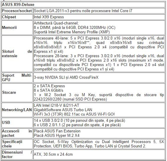 X99 Deluxe devine etalonul seriei și atinge viteze în Wi-Fi de până la 1300 Mbit/s, integrează și o placă ASUS Fan Extension pentru răcire suplimentară, dar și card de extensie Hyper M.2 x 4 pentru transfer de date de până la 32 Gbit/s.