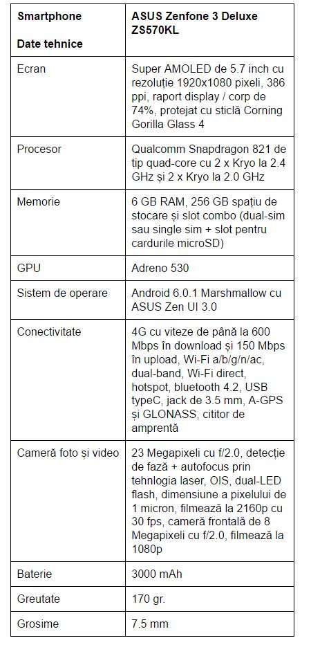 Am testat ASUS Zenfone 3 ZE520KL și Zenfone 3 ZE552KL. Acum a venit rândul pentru vârful de gamă, primul smartphone cu 6 GB RAM și 256 GB spațiu de stocare ce am ocazia să-i fac review, un adevărat monstru în ce privește specificațiile hardware, multă putere de procesare la pachet în corpul compact al lui Zenfone 3 Deluxe ZS570KL. Destul cu vorba, să ne concentrăm pe capitolele-cheie, specificațiile detaliate pentru flagship-ul taiwanez.