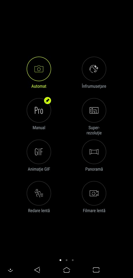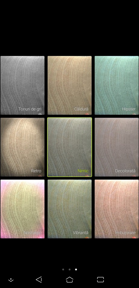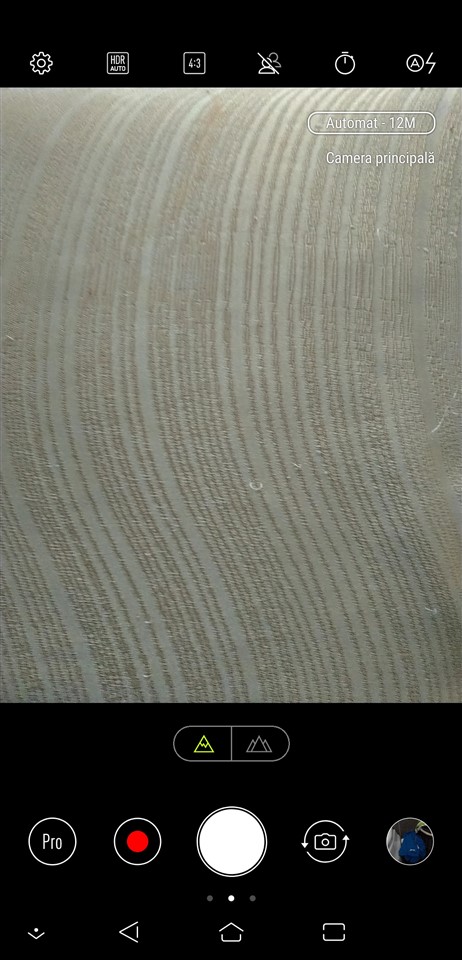 Alegerea modului Pro, al celui Video ori comutarea către camera frontală sunt așezate lângă declanșatorul modului Automat. Sus sunt butoanele pentru Setări, modul HDR (Auto, Oprit sau Pornit), Formatul imaginii (18:9, 16:9, 4:3 sau 1:1), modul Bokeh, Self Timer și Flash. Cu swipe de la stânga la dreapta ajungi în zona unde poți selecta între mai multe moduri de captare (Automat, Înfrumusețare, Pro, Super-rezoluție, Animație GIF, Panoramă, Redare lentă sau Filmare lentă), iar cu swipe de la dreapta la stânga vezi zona cu filtre, în total 8 disponibile.