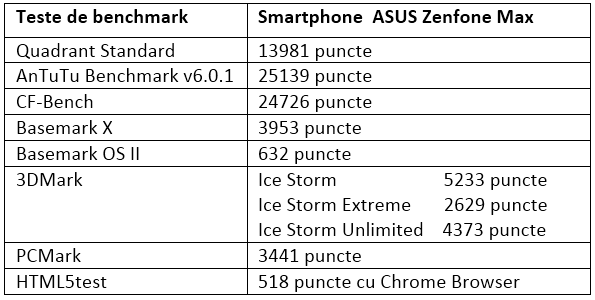 Toate rezultatele din testele de benchmark rulate de ASUS Zenfone Max sunt în tabelul de mai jos.