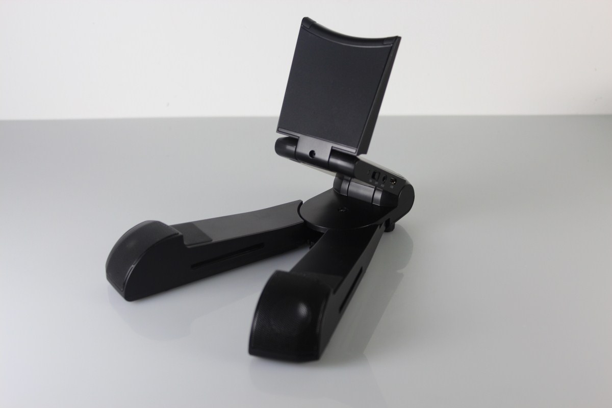 Picioarele sale sunt flexibile, iar standul ce susține tableta este format din 2 părți cu o micuță balama la mijloc. Are un grip bun și nu alunecă de pe birou, nu îți pune tableta în pericol la vreo mișcare mai bruscă a mesei. Aș spune că este un stand destul de bine fabricat, plastic mat, difuzoare la terminația picioarelor de susținere, elementele de conectivitate pe o latură.