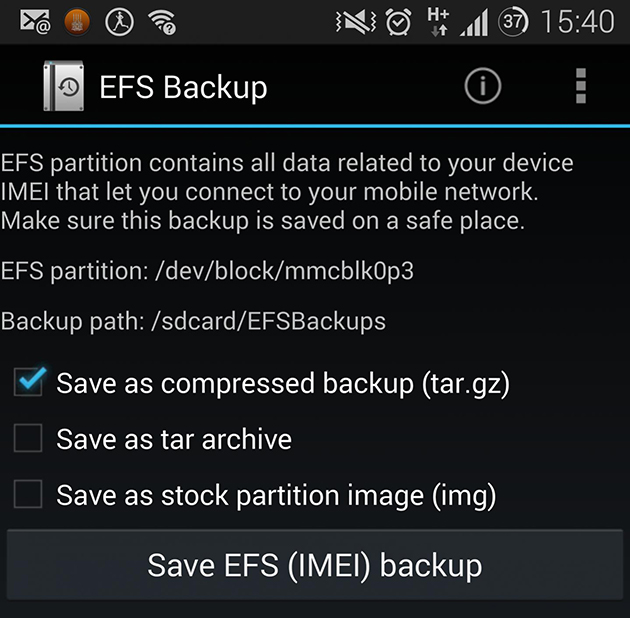 Din acest motiv, dezvoltatorul XDA wanam a creat o aplicație ce poate fi de folos multor posesori de device-uri Samsung ce doresc să testeze diferite custom ROM-uri. Aceasta se numește EFS IMEI Backup și poate fi descărcată din Play Store, singura cerință fiind accesul root.