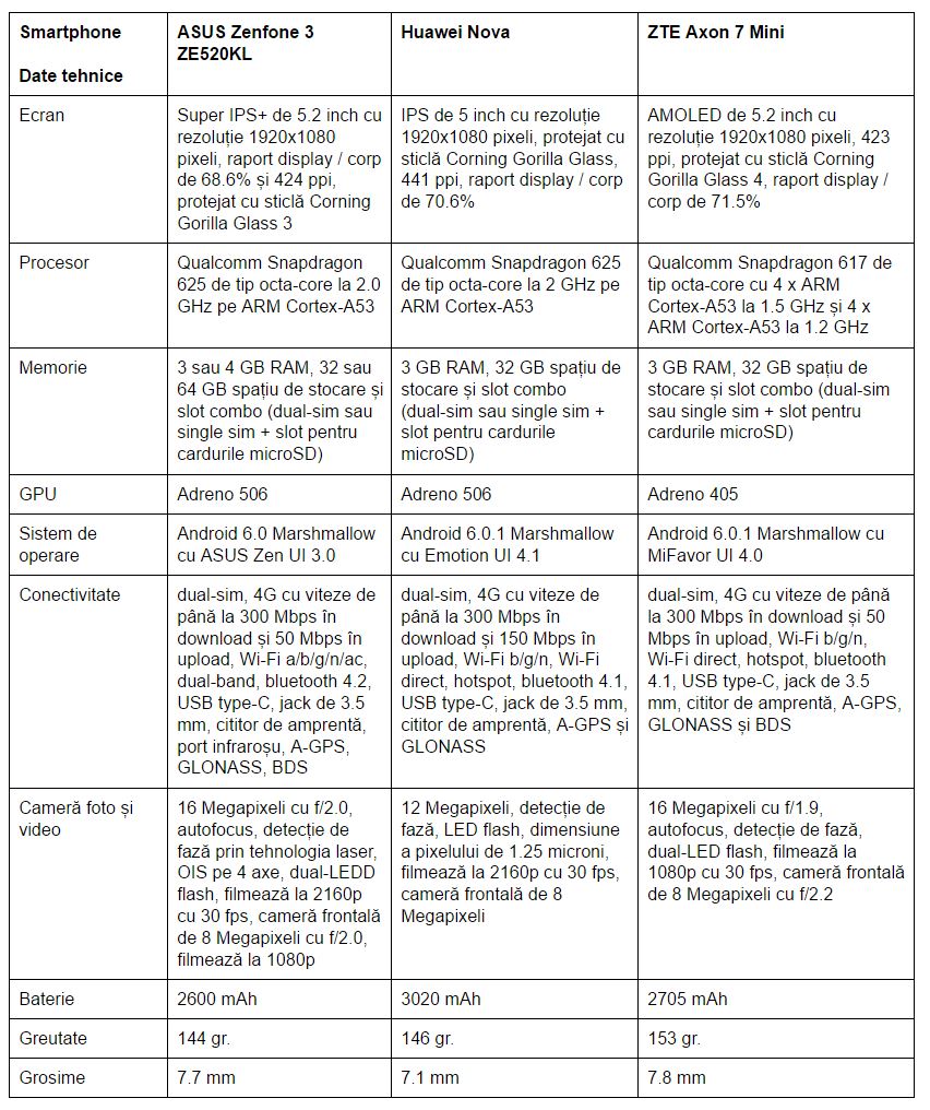 Până în 1500 lei poți primi un pachet complet, repet, la nivel de smartphone ce costă peste 2000 – 2500 lei. Trebuie să precizez că ASUS Zenfone 3 ZE520KL și Huawei Nova au fost testate ca atare, sper ca în viitorul apropiat să facem rost și de ZTE Axon 7 Mini. L-am adus în această companie selectă pentru că a sosit de curând în țara noastră pe canal oficial (Altex, Digi Mobil, eMAG), am remarcat că există interes crescut în ce privește telefoanele ZTE, în special pentru perechea Axon 7 și Axon 7 Mini.