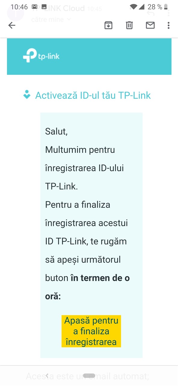 Primul pas după ce deschizi aplicația este să-ți faci un cont TP-Link, asta dacă nu ai deja unul. Pașii sunt cei obișnuiți: introduci o adresă de e-mail care va fi ulterior și numele de utilizator și alegi o parolă. În scurt timp vei primi un mail de confirmare al contului. Dai click pe link-ul din mail și gata, ai creat cont TP-Link.