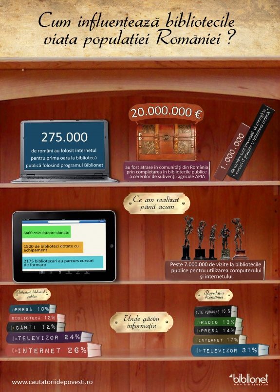 Am participat astăzi la o conferinţă în cadrul căreia a fost lansată provocarea “Căutători de poveşti”, parte a proiectului Biblionet. Biblionet este o iniţiativă a Fundaţiei Bill&Melinda Gates în valoare de 26,9 milioane de euro pe o durată de 5 ani (începând cu 2009) ce îşi propune facilitarea accesului la informaţie prin introducerea tehnologiei moderne în bibliotecile publice. Programul Biblionet include peste 1500 de biblioteci locale, dotate cu 6.460 de calculatoare şi echipamente aferente şi peste 2.175 de bibliotecari ce au parcurs cursuri de formare IT şi management al noilor servicii. Proiectul Biblionet a apărut ca o gură de oxigen pentru România, în conjunctura în care în anul 2011, 54% din populaţia ţării nu a folosit niciodată un calculator (conform unui studiu Eurostat).