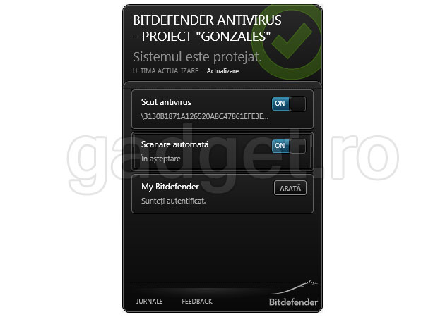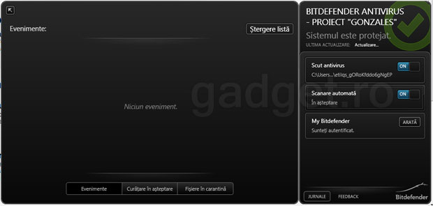 Imaginea de mai sus reprezintă unicul panou de control al BitDefender Gonzales. În afară de acest – dacă îi putem spune așa – panou de control, nu există nici o altă opțiune.