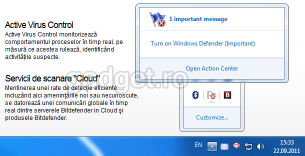 Prima problemă observată este faptul că Gonzales nu este compatibil, în acest moment, cu Windows Security Center. Concret, cu toate că Gonzales este instalat, Windows 7 continuă să anunțe faptul că nu este instalat un antivirus.