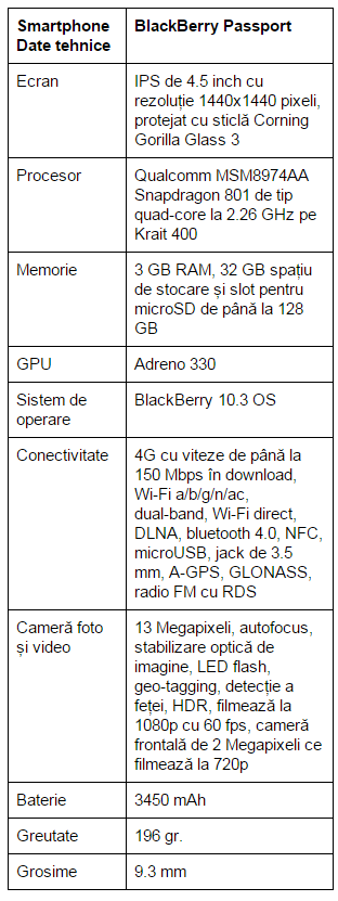 Pe de altă parte, BlackBerry își dorește să se individualizeze față de concurență și adoptă un form factor cu adevărat original. BlackBerry Passport este foarte lat, pătrățos, tastatură qwerty la bază + display tactil. Este un telefon pe care-l vei putea folosi doar în modul landscape. Destul cu vorbă, să trec la specificațiile sale detaliate. Să nu uit a preciza că am avut un sample de test sosit de la eMAG (nu a sosit în pachetul de retail ci doar smartphone-ul propriu-zis).