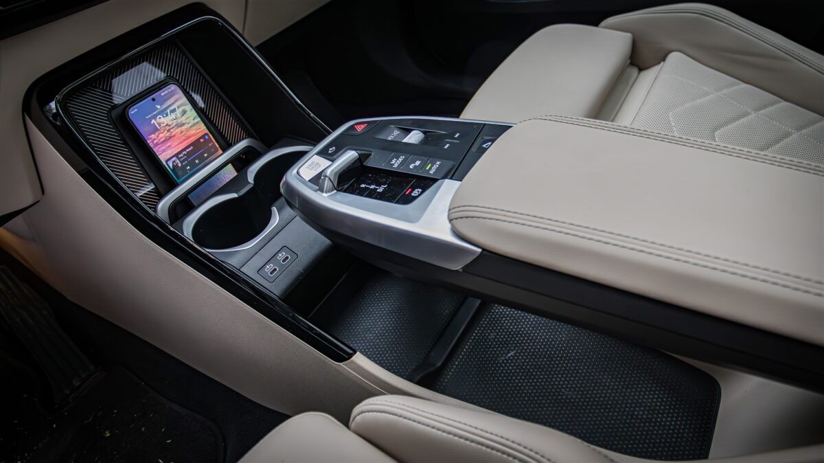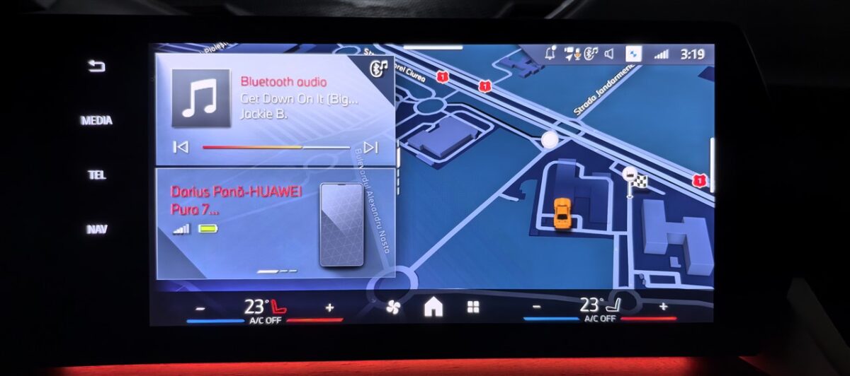 Mi-a plăcut locașul destinat smartphone-ului, de la baza bordului, ce ține telefonul cumva în poziție oblică. Există desigur și încărcare wireless, dar și un braț reglabil, ce ține telefonul fixat.