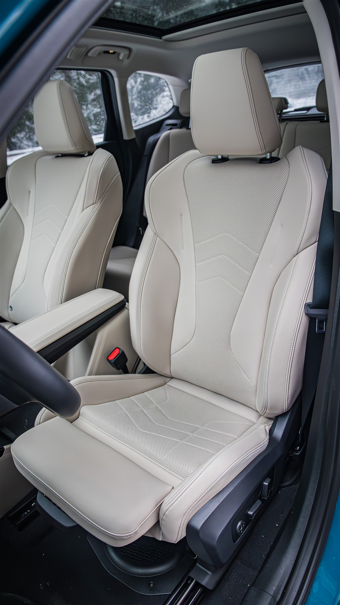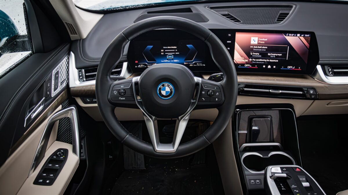 O altă surpriză plăcută a venit și la spațiul interior. Grație platformei ce presupune montarea transversală a motorului termic și cu tracțiune nativă pe puntea față, actualul X1 reușește să ofere mult loc, pe orice direcție, oricărui pasager. În față scaunele sunt, cum altfel, decât excelente, mai ales că în acest caz vorbim despre unele cu multiple reglaje electrice, dar și active. Pe banchetă, la fel, poziție foarte confortabilă și spațiu din belșug (raportat la dimensiunile exterioare) în principal la picioare, dar și la cap și pe lățime. Faptul că tracțiunea este pe puntea față, iar roțile spate sunt gestionate de un motor electric, deci fără conexiune mecanică (cardan) între cele două punți, nu există nici un tunel median masiv, care să răpească din spațiul la picioare al pasagerului ce va sta pe mijlocul banchetei.