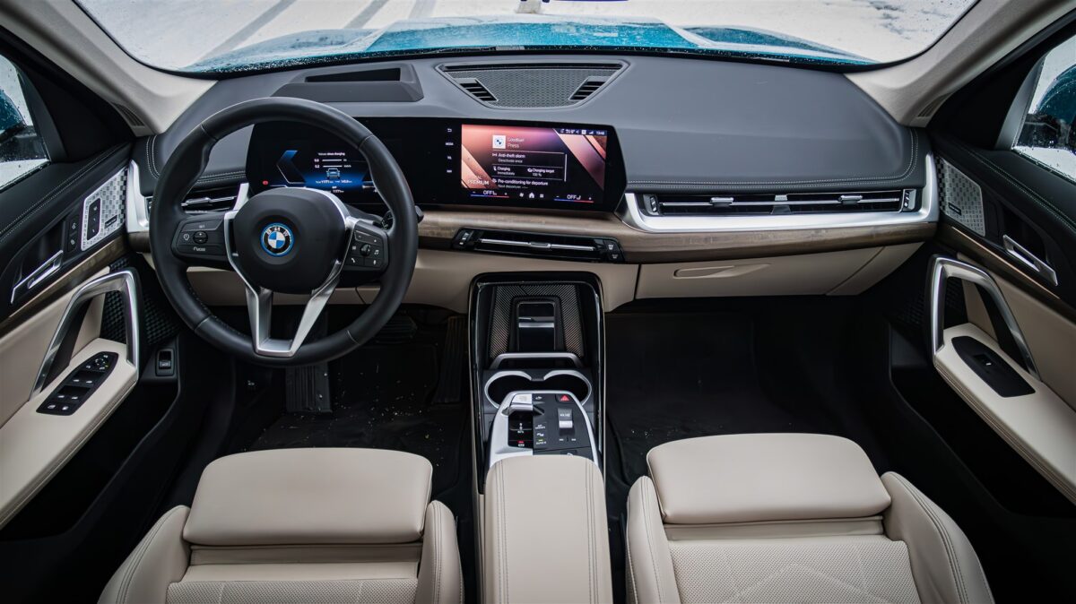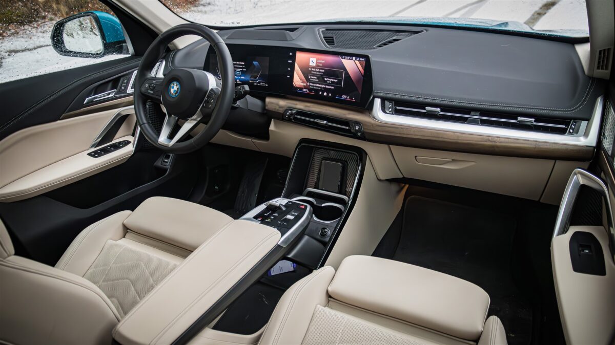 La interior, legătura cu predecesorii nu mai este atât de evidentă, aici BMW X1 2024 preia cea mai mare parte a noutăților din ultimii ani. Mă refer, în primul rând, la sticla ușor curbată în spatele căreia sunt cele două ecrane cu rol de panou de bord, pe de o parte, respectiv sistem infotainment, pe de alta. Apoi, sunt multiple alte elemente ce-ți transmit clar că ești într-un BMW de generație actuală, dar sunt și unele implementări unice.
