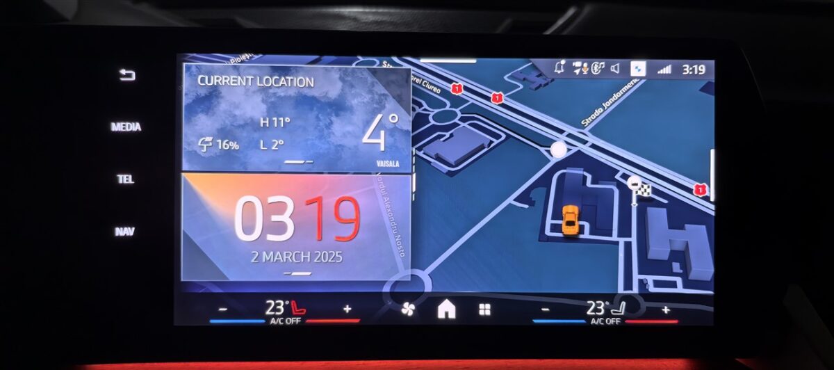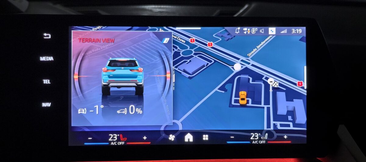 Apoi, nu pot să nu amintesc din nou (am mai făcut-o mereu, la fiecare BMW care a avut această opțiune), despre realitatea augmentată ce apare în navigație. Din nou este folosită camera frontală, dar acum când este nevoie să treci printr-o intersecție sau să schimbi banda, de exemplu. În mod automat apare în bord ceea ce filmează camera frontală și o linie, o săgeată care este pusă fix pe banda pe care trebuie să o urmezi, conform navigației. Este foarte utilă această implementare în intersecțiile complicate, cu multe benzi…