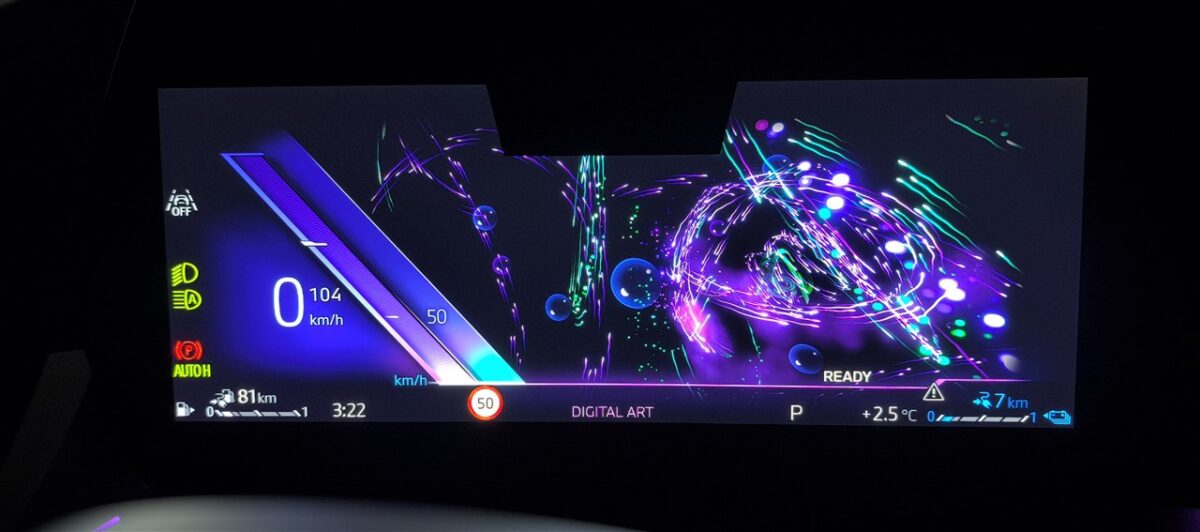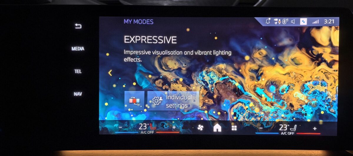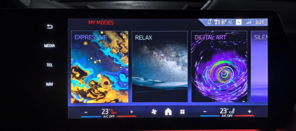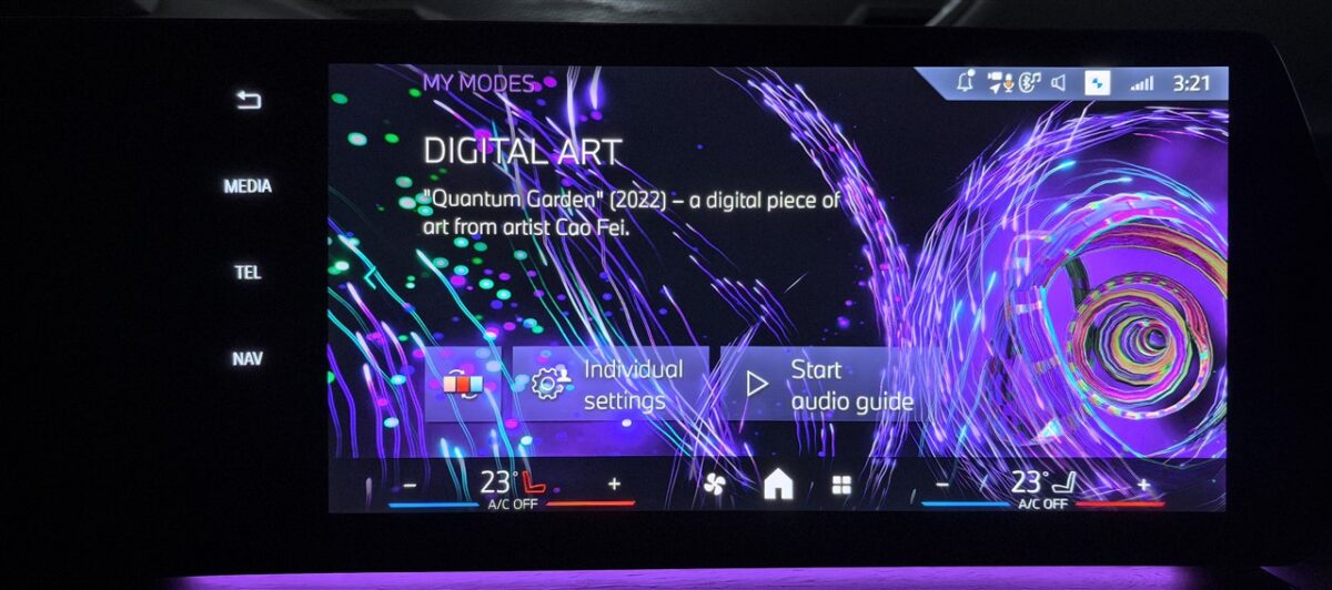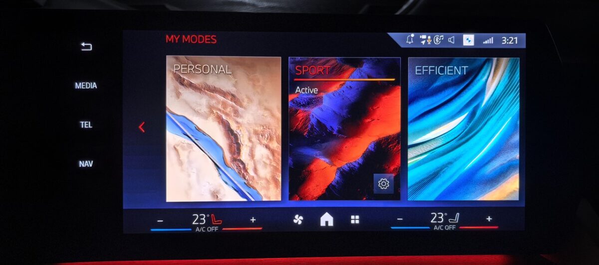 Până la a le înșira pe cele care au fost bifate pe mașina de test, haideți să vedem, mai întâi, cum arată panoul de bord, mai precis care sunt câteva dintre ecranele ce pot fi afișate în funcție de modurile de condus alese – Personal, Sport, Efficient, Expressive, Relax, Digital Art și Silent.
