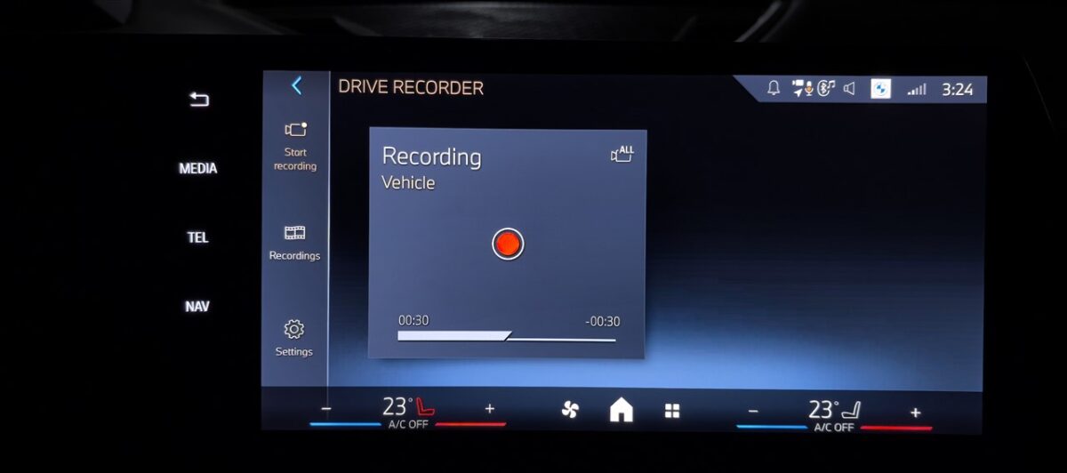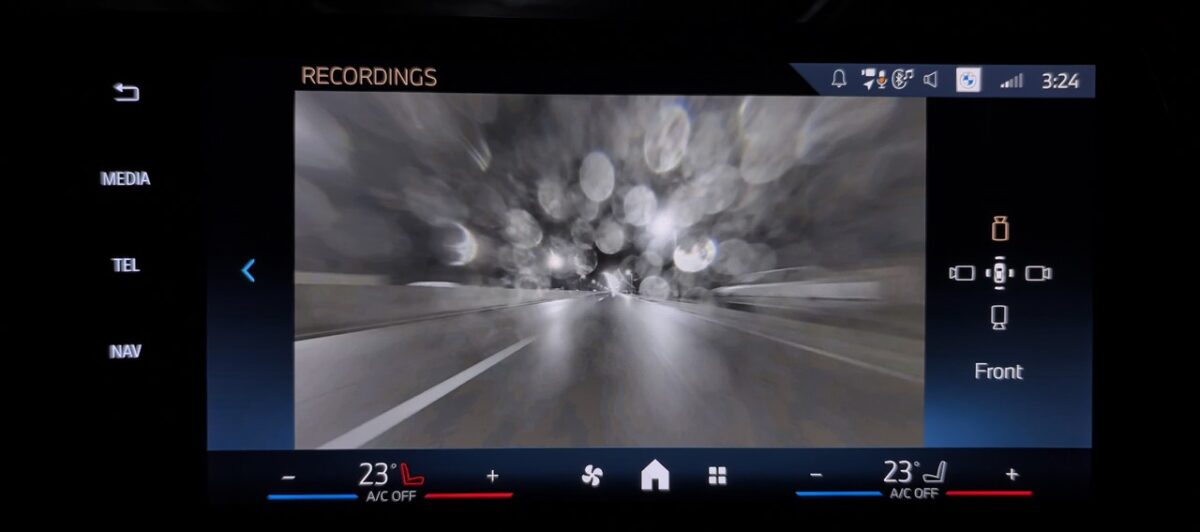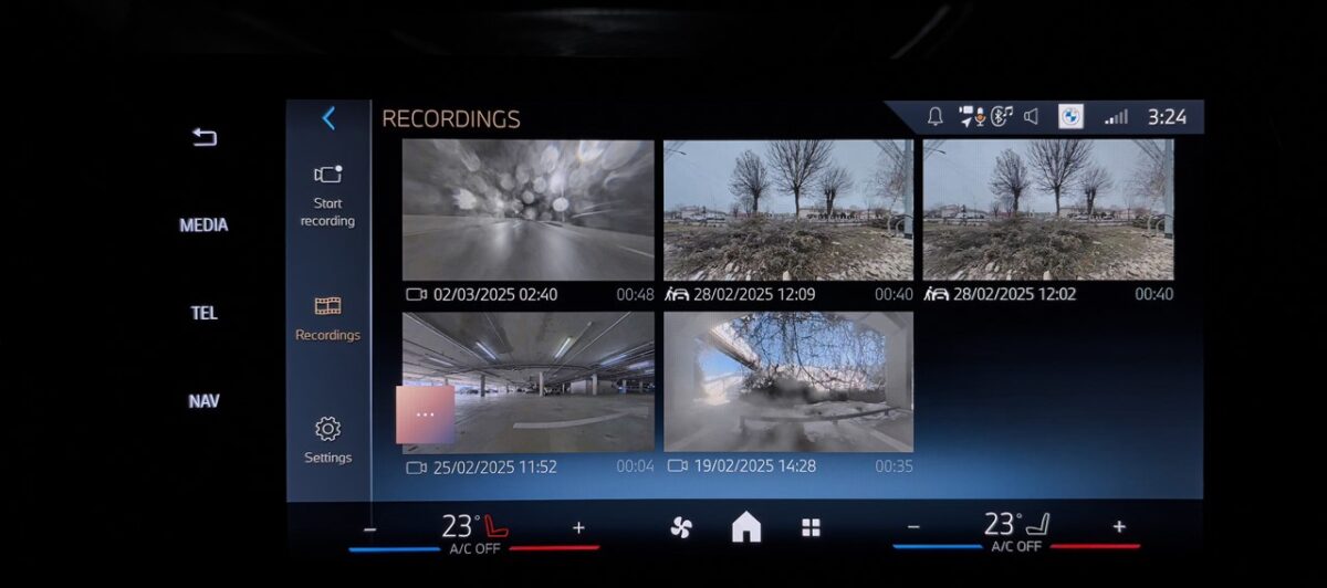 Ce merită precizat aici este că există opțiunea de înregistra ce captează oricare dintre camerele de pe și din mașină. Deci, poți alege camera și poți da Record în orice moment, însă oricum toate camerele filmează continuu și stochează pentru scurt timp fișierele, pe care le păstrează apoi numai în caz de eveniment rutier.