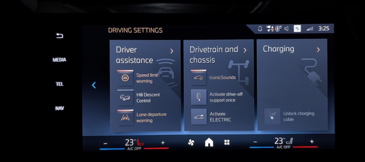 Evident, ca la orice PHEV modern și care se respectă, poți alege să mergi strict EV (dacă este energie în baterie), să forțezi rularea pe termic (în caz că vrei să păstrezi bateria pentru rulare EV ulterioară), să alegi ca motorul termic să încarce și bateria în timp ce se ocupă și de partea de tracțiune sau să lași sistemul să decidă (mai mereu se va merge inițial EV până la epuizarea bateriei, apoi se trece pe Hybrid).