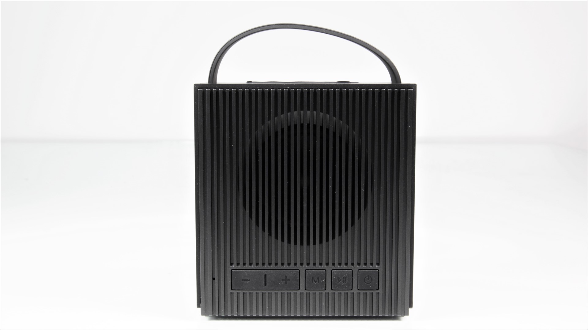 Grila difuzorului este poziționată pe partea de sus, acolo unde sunt și 5 butoane de control al anumitor funcții. Avem Volum – și +, Mod, Play / Pause și Power. Încă un buton mai este amplasat pe laterala din spate, lângă zona cu elementele de conectivitate, acoperită de un capac de cauciuc. Acest buton reglează în trei trepte iluminarea ecranului LCD din partea frontală. Tot pe laterala din spate găsim și un mâner din cauciuc, ce face transportarea boxei mai facilă.
