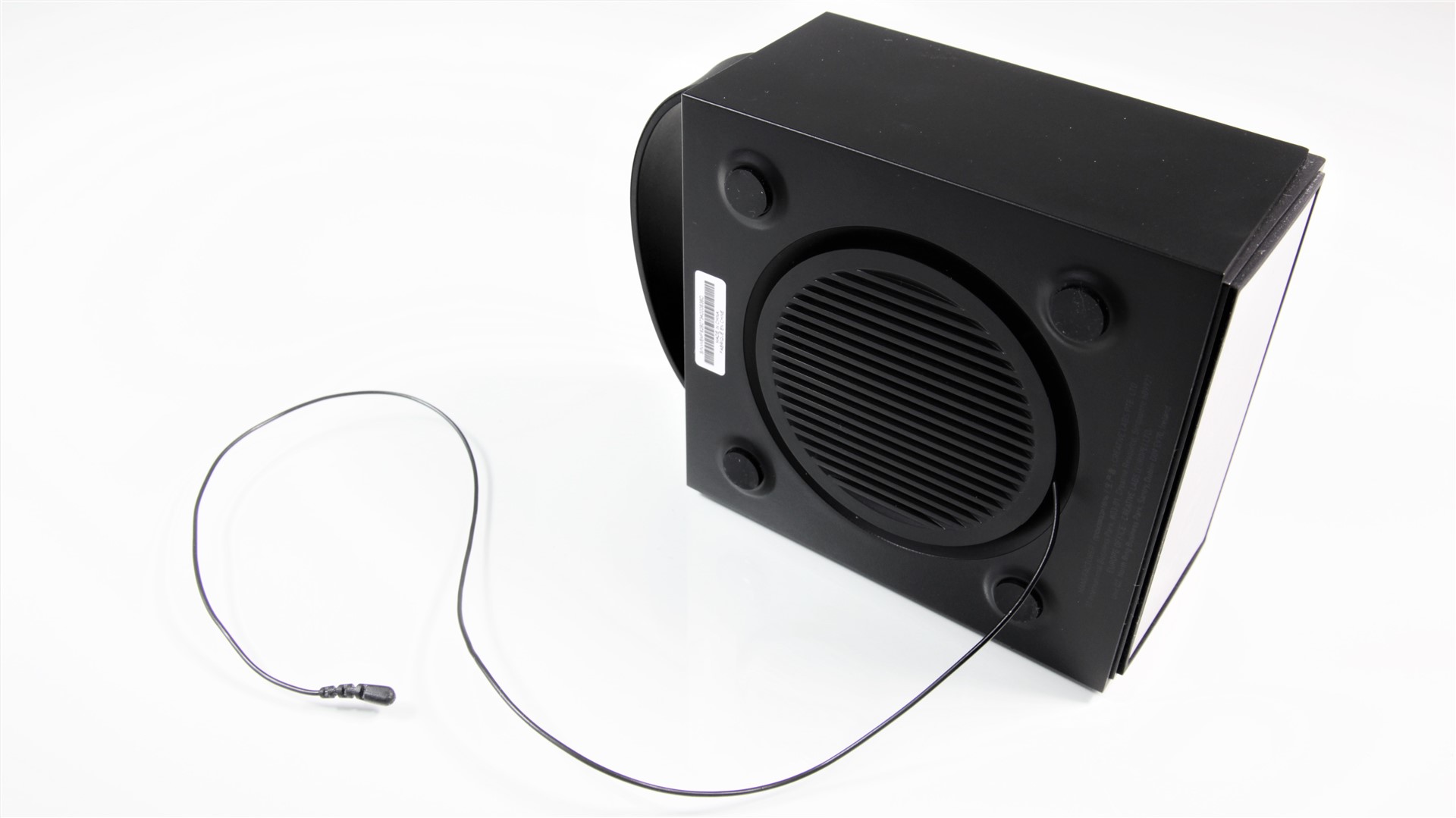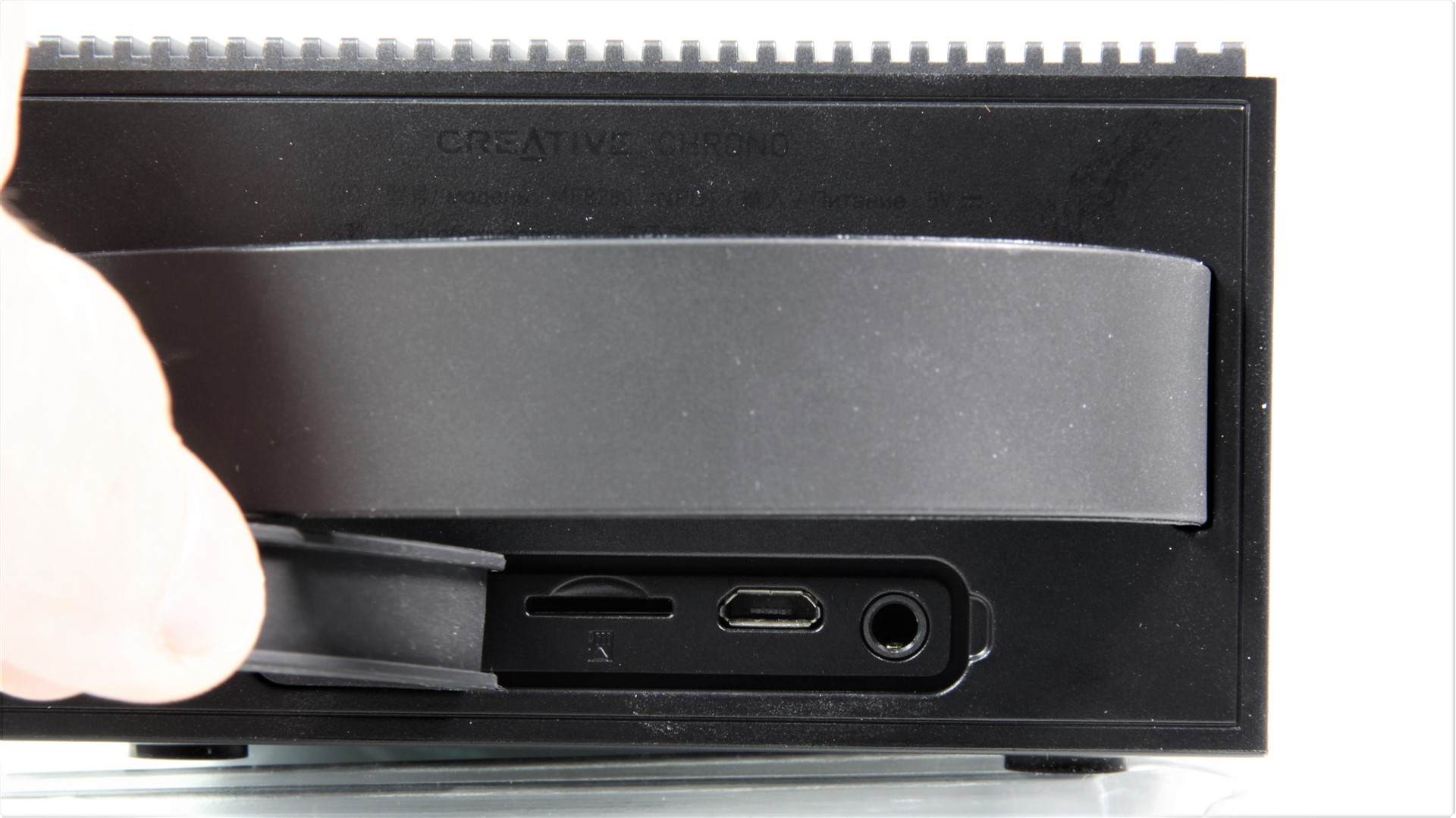 Creative Chrono integrează și radio FM, iar pentru o recepție corespunzătoare este nevoie și de o antenă, nu-i așa? Ei bine, boxa dispune și de așa ceva, dar firul este ascuns, atunci când nu este nevoie de el, pe partea posterioară a dispozitivului, având parte de un locaș dedicat, unde se înfășoară și rămâne de nevăzut.