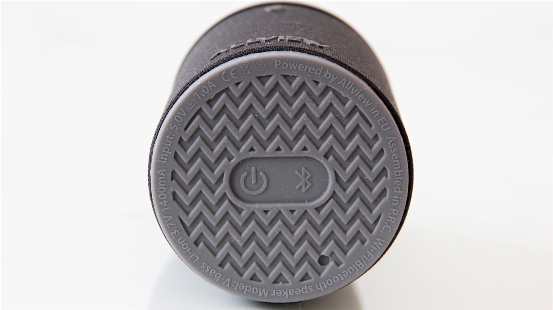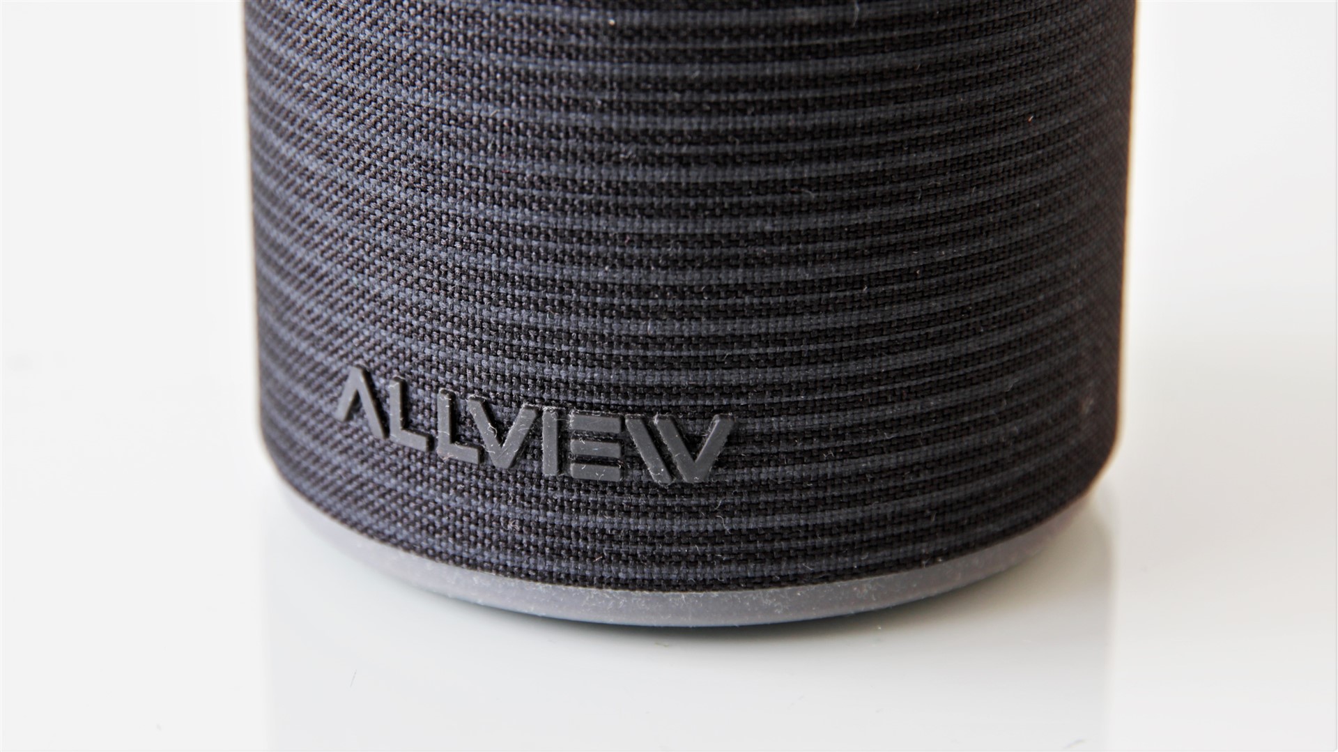 Allview V-bass este o boxă elegantă, compactă, realizată din plastic, în mare parte acoperită cu material textil, și cauciuc. Lasă o impresie plăcută, pare bine fabricată, alcătuită din materiale corecte.