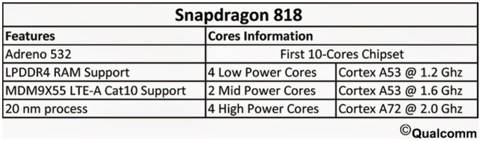 Conform informaţiilor neoficiale de la ora actuală, Qualcomm Snapdragon 818 va fi un procesor de tip big.LITTLE cu 4 nuclee ARM Cortex-A53 tactate la 1.2 GHz, 4 nuclee ARM Cortex-A72 tactate la 2.0 GHz şi încă 2 nuclee ARM Cortex-A53 tactate la 1.6 GHZ. Procesorul va oferi suport pentru LTE Cat.10, pentru memorii LPDDR4, va utiliza acceleratorul grafic Adreno 532 şi va fi produs pe tehnologie de 20 nm.
