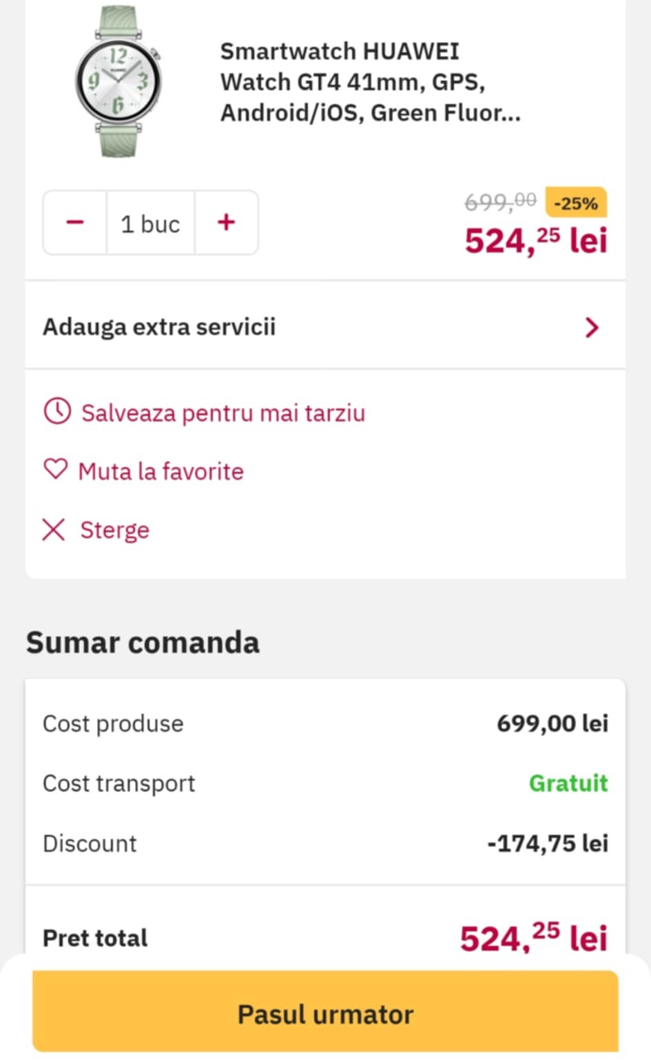 Pentru a beneficia de acest super preţ, intraţi în aplicaţia mobilă a celor de la Altex, selectaţi ceasul şi aplicaţi codul HUAWEI25APP (acesta este disponibil deja în secţiunea “adaugă extra cupoane”).